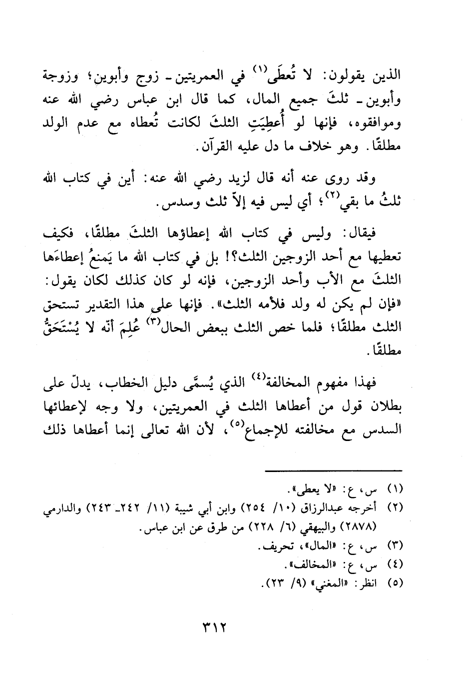 فهذا مفهوم المخالفة (4) الذي يُسمى دليل الخطاب، يدلّ على بطلان قول من أعطاها الثلث في العمريتين، ولا وجه لإعطائها السدس مع مخالفته للإجماع (5)، لأن الله تعالى إنما أعطاها ذلك