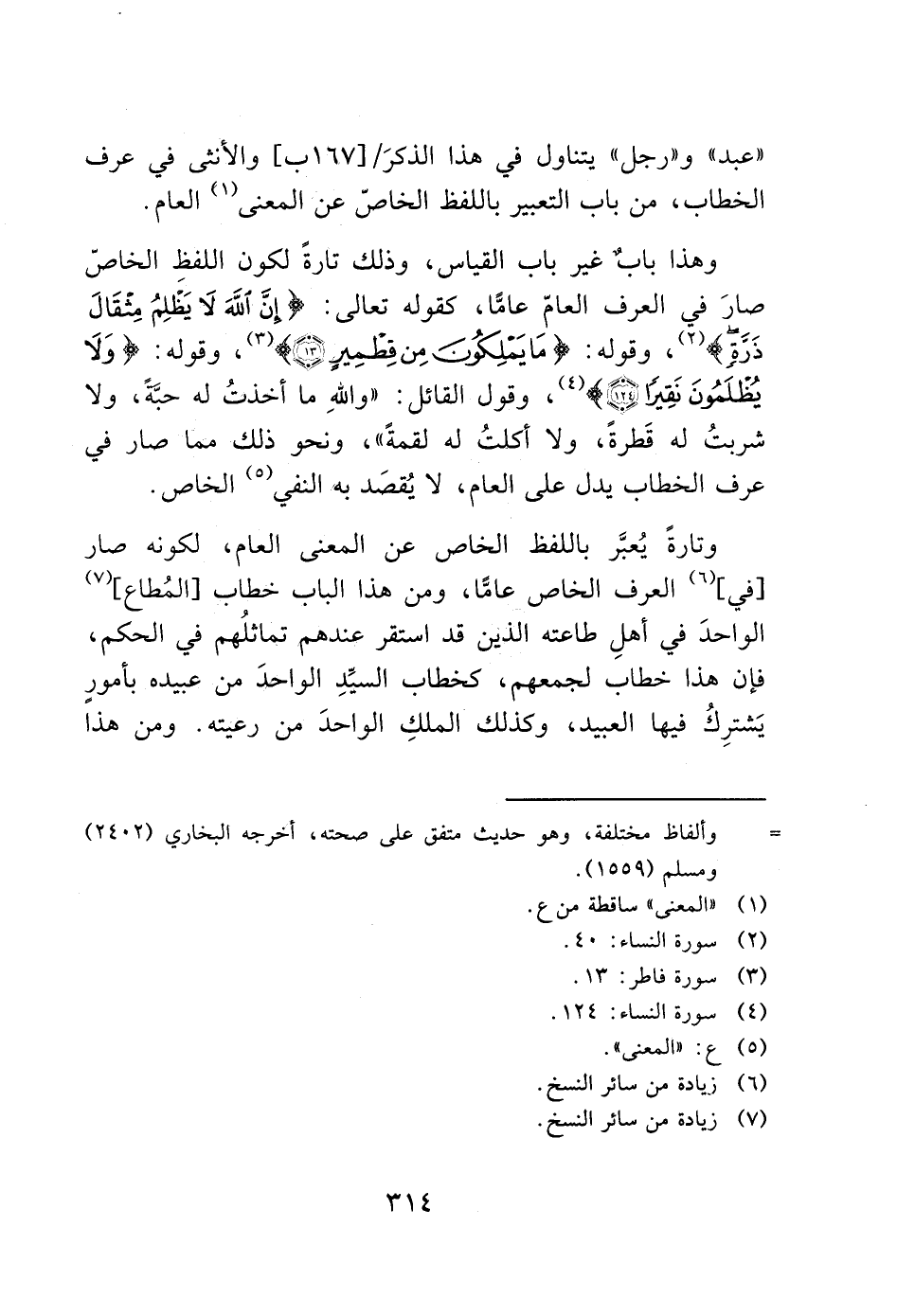 وهذا بابٌ غير باب القياس، وذلك تارةً لكون اللفظ الخاصّ صارَ في العرف العامّ عامًّا، كقوله تعالى: (إِنَّ اللَّهَ لَا يَظْلِمُ مِثْقَالَ ذَرَّةٍ) (2)، وقوله: (مَا يَمْلِكُونَ مِنْ قِطْمِيرٍ (13)) (3)، وقوله: (وَلَا يُظْلَمُونَ نَقِيرًا (124)) (4)، وقول القائل: "والله ما أخذتُ له حبّهً، ولا شربتُ له قَطرةً، ولا أكلتُ له لقمةً"، ونحو ذلك مما صار في عرف الخطاب يدل على العام، لا يُقصَد بهَ النفي (5) الخاص.