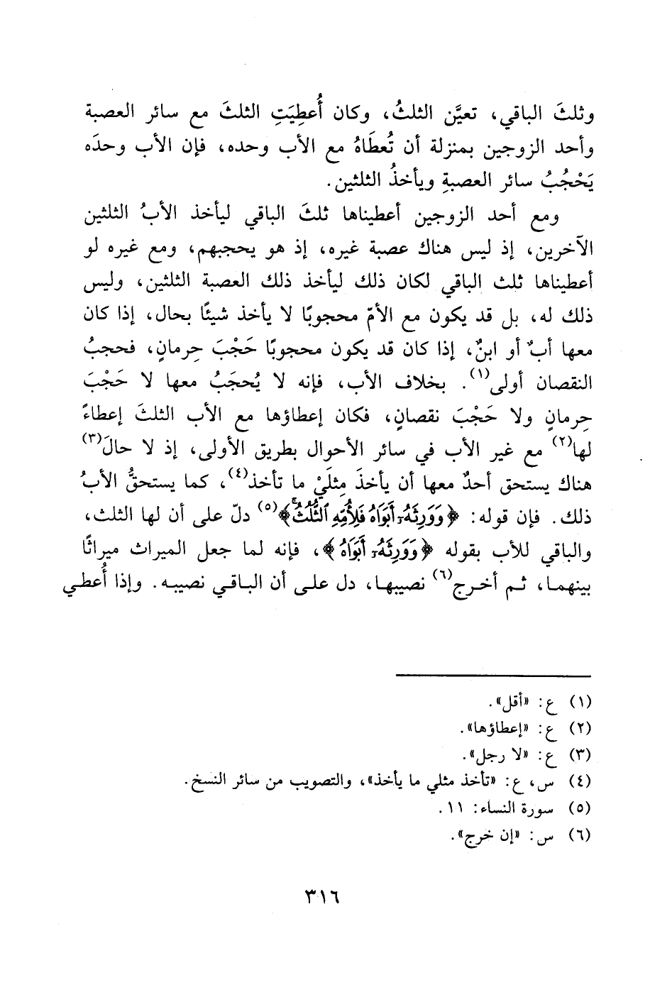 ومع أحد الزوجين أعطيناها ثلثَ الباقي ليأخذ الأبُ الثلثين الآخرين، إذ ليس هناك عصبة غيره، إذ هو يحجبهم، ومع غيره لو أعطيناها ثلث الباقي لكان ذلك ليأخذ ذلك العصبة الثلثين، وليس ذلك له، بل قد يكون مع الأمّ محجوبًا لا يأخذ شيئًا بحال، إذا كان معها أب أو ابن، إذا كان قد يكون محجوبا حَجْبَ حِرمانٍ، فحجبُ النقصان أولى (1). بخلاف الأب، فإنه لا يُحجَبُ معها لا حَجْبَ حِرمانٍ ولا حَجْبَ نقصان، فكان إعطاؤها مع الأب الثلثَ إعطاءً (2) مع غير الأب في سائر الأحوال بطريق الأولى، إذ لا حالَ (3) هناك يستحق أحد معها أن يأخذَ مِثلَيْ ما تأخذ (4)، كما يستحقُّ الأبُ ذلك. فإن قوله: (وَوَرِثَهُ أَبَوَاهُ فَلِأُمِّهِ الثُّلُثُ) (5) (دلّ على أن لها الثلث، والباقي للأب بقوله (وَوَرِثَهُ أَبَوَاهُ)،فإنه لما جعل الميراث ميراثًا بينهما، ثم أخرج (6) نصيبها، دل على أن الباقي نصيبه. وإذا أُعطي