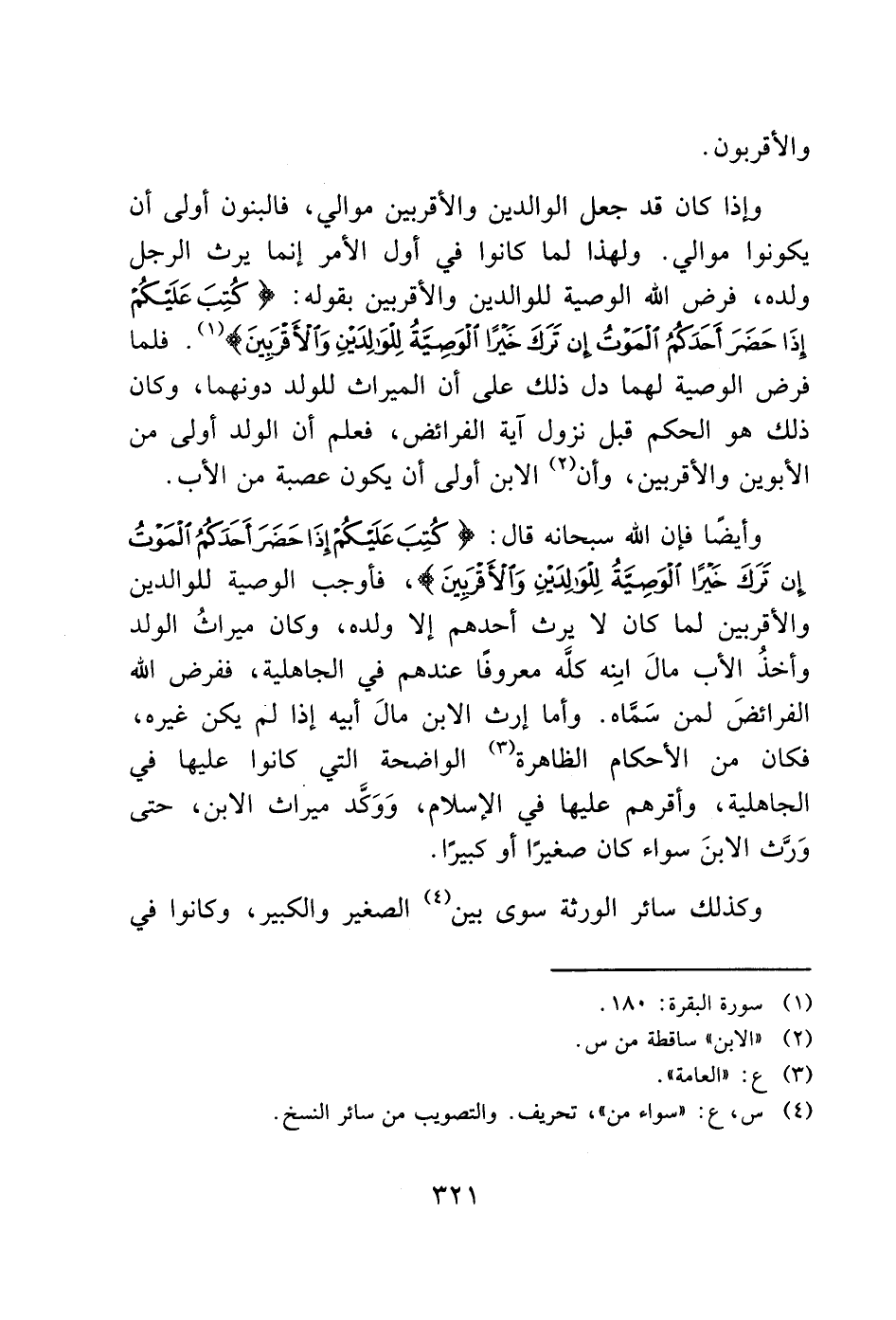 وأيضا فإن الله سبحانه قال: (كُتِبَ عَلَيْكُمْ إِذَا حَضَرَ أَحَدَكُمُ الْمَوْتُ إِنْ تَرَكَ خَيْرًا الْوَصِيَّةُ لِلْوَالِدَيْنِ وَالْأَقْرَبِينَ)، فأوجب الوصية للوالدين والأقربين لما كان لا يرث أحدهم إلاّ ولده، وكان ميراثُ الولد وأخذُ الأب مالَ ابنه كلَّه معروفًا عندهم في الجاهلية، ففرض الله الفرائضَ لمن سَمَّاه. وأما إرث الابن مالَ أبيه إذا لم يكن غيره، فكان من الأحكام الظاهرة (3) الواضحة التي كانوا عليها في الجاهلية، وأقرهم عليها في الإسلام، وَوَكَّد ميراث الابن، حتى وَرَّث الابنَ سواء كان صغيرا أو كبيرًا.