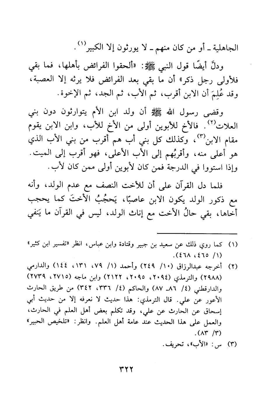 وقضى رسول الله - صَلَّى اللَّهُ عَلَيْهِ وَسَلَّمَ - أن ولد ابن الأم يتوارثون دون بني العلات (2). فالأخ للأبوين أولى من الأخ للأب، وابن الابن يقوم مقام الابن (3)، وكذلك كل بني أب هم أقرب من بني الأب الذي هو أعلى منه، وأقربُهم إلى الأب الأعلى، فهو أقرب إلى الميت. وإذا استووا في الدرجة فمن كان لأبوين أولى ممن كان لأب.