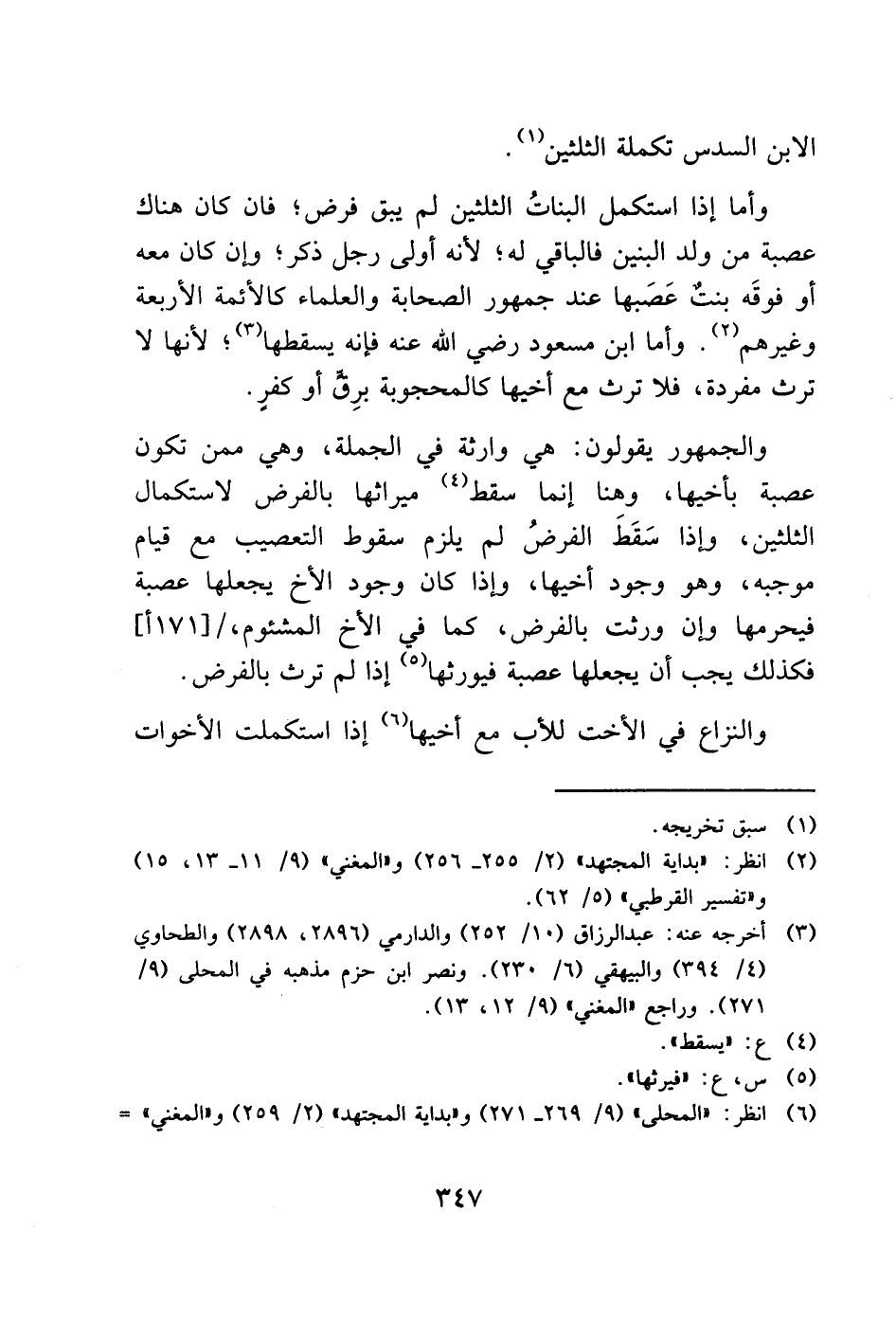 وأما إذا استكمل البناتُ الثلثين لم يبق فرض؛ فان كان هناك عصبة من ولد البنين فالباقي له؛ لأنه أولى رجل ذكر؛ وإن كان معه أو فوقَه بنتٌ عَصَبها عند جمهور الصحابة والعلماء كالأئمة الأربعة وغيرهم (2). وأما ابن مسعود رضي الله عنه فإنه يسقطها (3)؛ لأنها لا ترث مفردة، فلا ترث مع أخيها كالمحجوبة برِق أو كفر.
