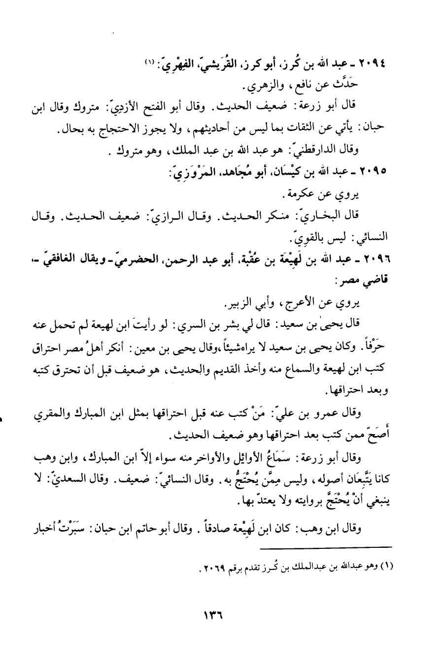 2096 - عبد الله بن لَهِيعَة بن عقبَة أَبُو عبد الرَّحْمَن الْحَضْرَمِيّ وَيُقَال الغافقي قَاضِي مصر يروي عَن الْأَعْرَج وَأبي الزبير قَالَ يحيى بن سعيد قَالَ لي بشر بن السّري لَو رَأَيْت ابْن لَهِيعَة لم تحمل عَنهُ حرفا وَكَانَ يحيى بن سعيد لَا يرَاهُ شَيْئا وَقَالَ يحيى بن معِين أنكر أهل مصر احتراق كتب ابْن لَهِيعَة وَالسَّمَاع مِنْهُ وَأخذ الْقَدِيم والْحَدِيث هُوَ ضَعِيف قبل ان تحترق كتبه وَبعد احتراقها وَقَالَ عَمْرو بن عَليّ من كتب عَنهُ قبل احتراقها بِمثل ابْن الْمُبَارك والمقري أصح مِمَّن كتب بعد احتراقها وَهُوَ ضَعِيف الحَدِيث وَقَالَ أَبُو زرْعَة سَماع الْأَوَائِل والأواخر مِنْهُ سَوَاء إِلَّا ابْن الْمُبَارك وَابْن وهب كَانَا يتبعان أُصُوله وَلَيْسَ مِمَّن يحْتَج وَقَالَ النَّسَائِيّ ضَعِيف وَقَالَ السَّعْدِيّ لَا يَنْبَغِي أَن يحْتَج بروايته وَلَا يعْتد بهَا بروايته وَلَا يعْتد بهَا وَقَالَ ابْن وهب كَانَ ابْن لَهِيعَة صَادِقا وَقَالَ أَبُو حَاتِم ابْن حبَان سبرت أَخْبَار
