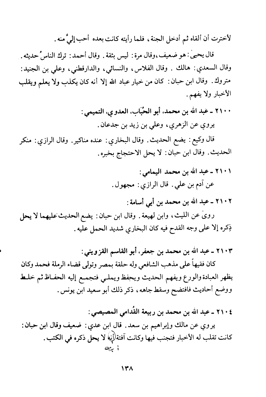 2102 - عبد الله بن مُحَمَّد بن أبي أُسَامَة روى عَن اللَّيْث وَابْن لَهِيعَة وَقَالَ ابْن حبَان يضع الحَدِيث عَلَيْهِمَا لَا يحل ذكره إِلَّا على وَجه الْقدح فِيهِ كَانَ البُخَارِيّ شَدِيد الْحمل عَلَيْهِ