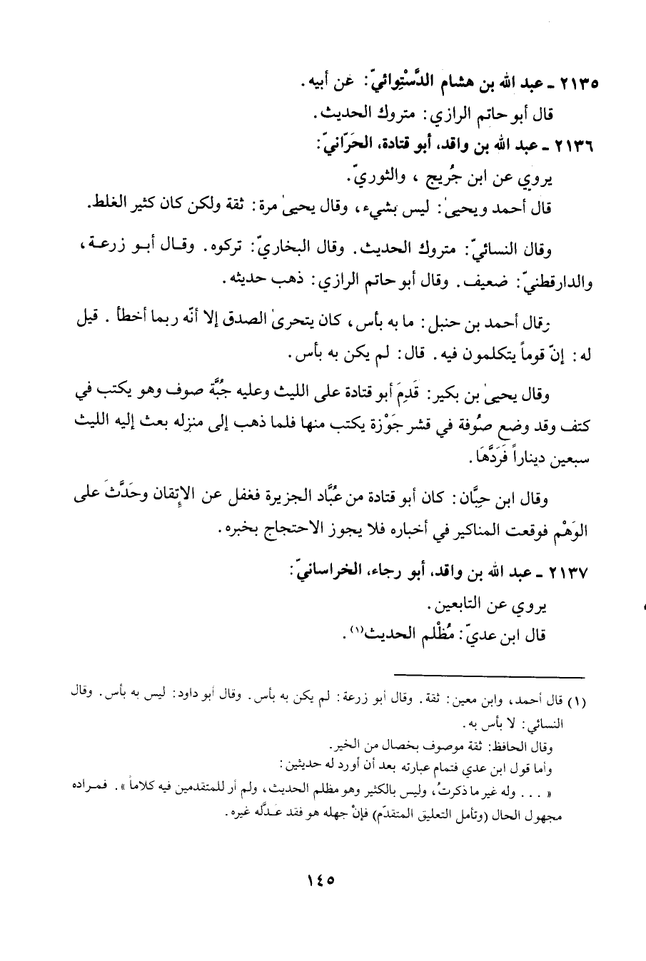 2136 - عبد الله بن وَاقد أَبُو قَتَادَة الْحَرَّانِي يروي عَن ابْن جريح وَالثَّوْري قَالَ أَحْمد وَيحيى لَيْسَ بِشَيْء وَقَالَ يحيى مرّة ثِقَة وَلَكِن كَانَ كثير الْغَلَط وَقَالَ النَّسَائِيّ مَتْرُوك الحَدِيث وَقَالَ البُخَارِيّ تَرَكُوهُ وَقَالَ أَبُو زرْعَة وَالدَّارَقُطْنِيّ ضَعِيف وَقَالَ أَبُو حَاتِم الرَّازِيّ ذهب حَدِيثه