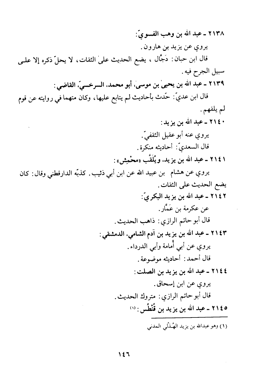 2145 - عبد الله بن يزِيد بن قنطس قَالَ النَّسَائِيّ لَيْسَ بِثِقَة وَقَالَ البُخَارِيّ يتهم بِأَمْر عَظِيم
