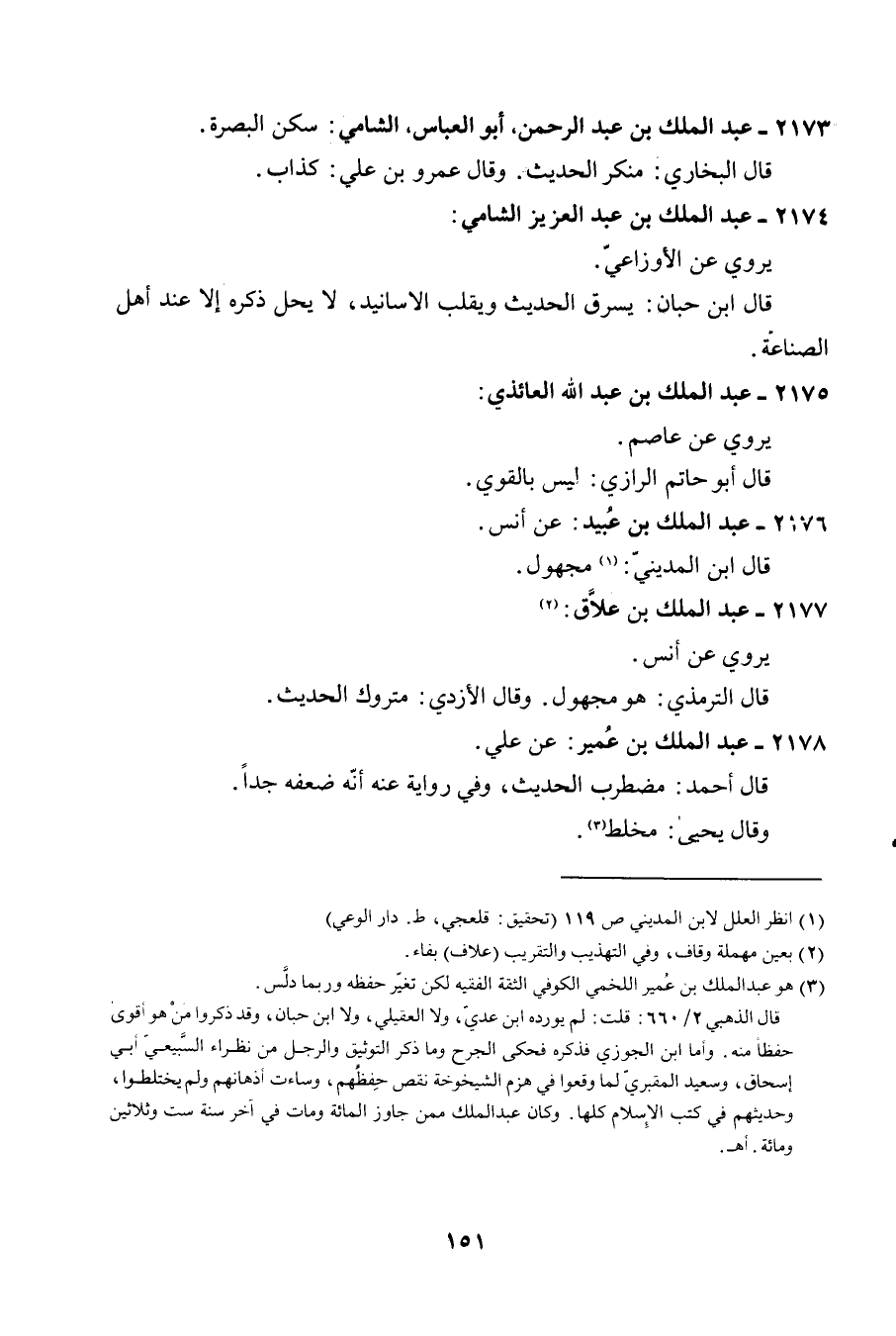 2173 - عبد الْملك بن عبد الرَّحْمَن أَبُو الْعَبَّاس الشَّامي سكن الْبَصْرَة قَالَ البُخَارِيّ مُنكر الحَدِيث وَقَالَ عَمْرو بن عَليّ كَذَّاب