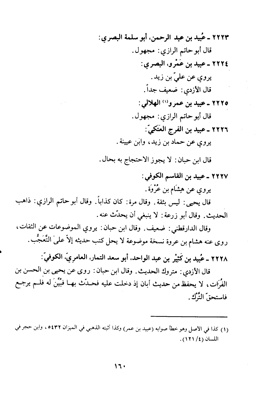 2226 - عبيد بن الْفرج الْعَتكِي يروي عَن حَمَّاد بن زيد وَابْن عُيَيْنَة قَالَ ابْن حبَان لَا يجوز الِاحْتِجَاج بِهِ بِحَال