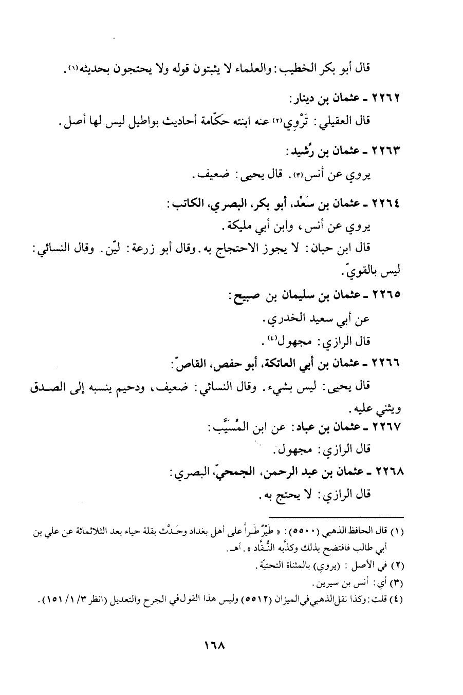 2268 - عُثْمَان بن عبد الرَّحْمَن الجُمَحِي الْبَصْرِيّ قَالَ الرَّازِيّ لَا يحْتَج بِهِ