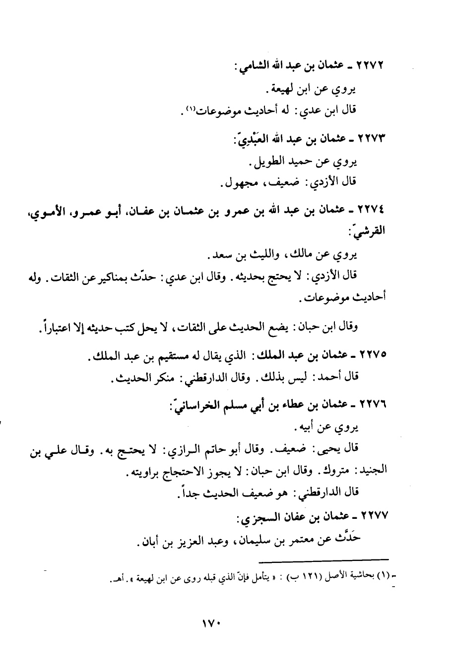 2272 - عُثْمَان بن عبد الله الشَّامي يروي عَن ابْن لَهِيعَة قَالَ ابْن عدي لَهُ أَحَادِيث مَوْضُوعَات