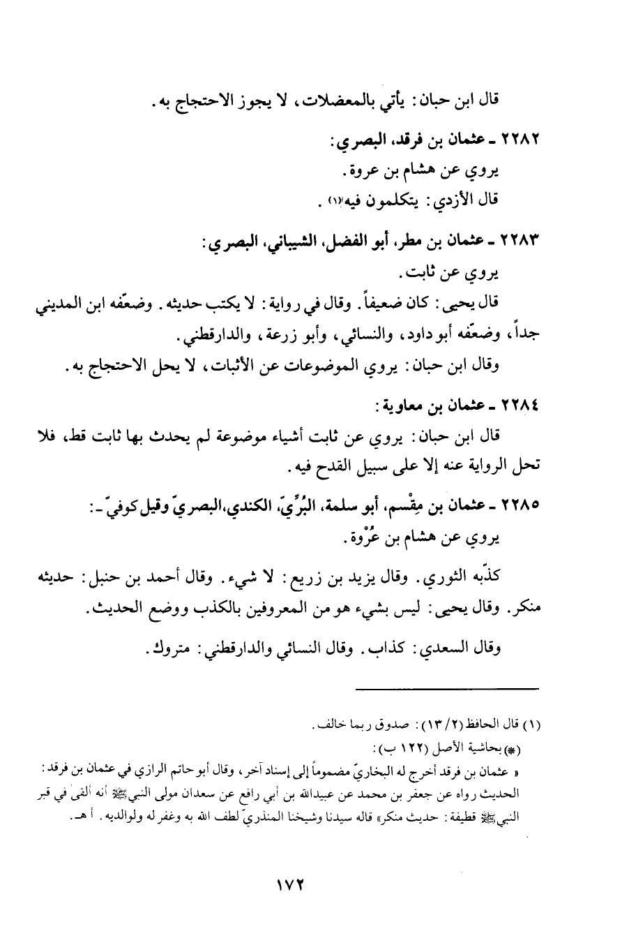 2284 - عُثْمَان بن مُعَاوِيَة قَالَ ابْن حبَان يروي عَن ثَابت أَشْيَاء مَوْضُوعَة لم يحدث بهَا ثَابت قطّ فَلَا تحل الرِّوَايَة عَنهُ إِلَّا على سَبِيل الْقدح فِيهِ