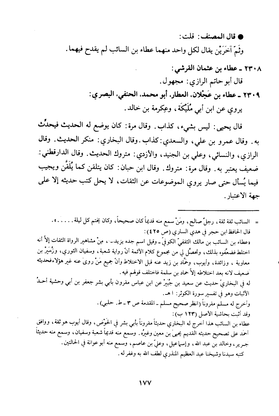 2309 - عَطاء بن عجلَان الْعَطَّار أَبُو مُحَمَّد الْحَنَفِيّ الْبَصْرِيّ يروي عَن ابْن أبي ملكية وَعِكْرِمَة بن خَالِد قَالَ يحيى لَيْسَ بِشَيْء كَذَّاب وَقَالَ مرّة كَانَ يوضع لَهُ الحَدِيث فَيحدث بِهِ وَقَالَ عَمْرو بن عَليّ وَالسَّعْدِي كَذَّاب وَقَالَ البُخَارِيّ مُنكر الحَدِيث وَقَالَ الدَّارَقُطْنِيّ ضَعِيف يعْتَبر بِهِ وَقَالَ مرّة مَتْرُوك وَقَالَ ابْن حبَان كَانَ يَتَلَقَّن كَمَا يلقن ويجيب فِيمَا يسْأَل حَتَّى صَار يروي الموضوعات عَن الثِّقَات لَا يحل كتب حَدِيثه إِلَّا على جِهَة الِاعْتِبَار