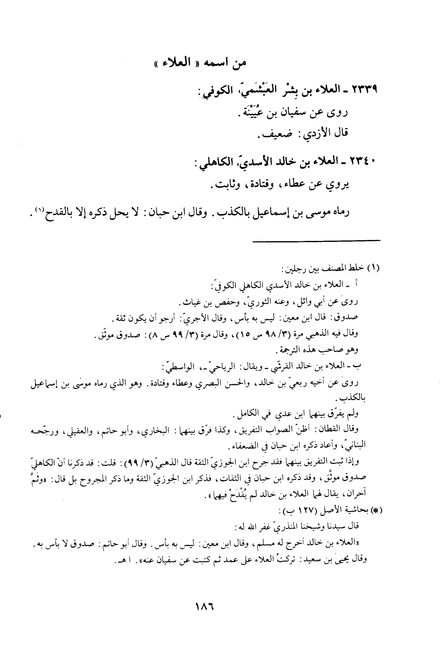 2340 - الْعَلَاء بن خَالِد الْأَسدي الْكَاهِلِي يروي عَن عَطاء وَقَتَادَة وثابت رَمَاه مُوسَى بن إِسْمَاعِيل بِالْكَذِبِ وَقَالَ ابْن حبَان لَا يحل ذكره إِلَّا بالقدح قَالَ المُصَنّف قلت وَثمّ آخرَانِ يُقَال لَهما الْعَلَاء بن خَالِد لم يقْدَح فيهمَا