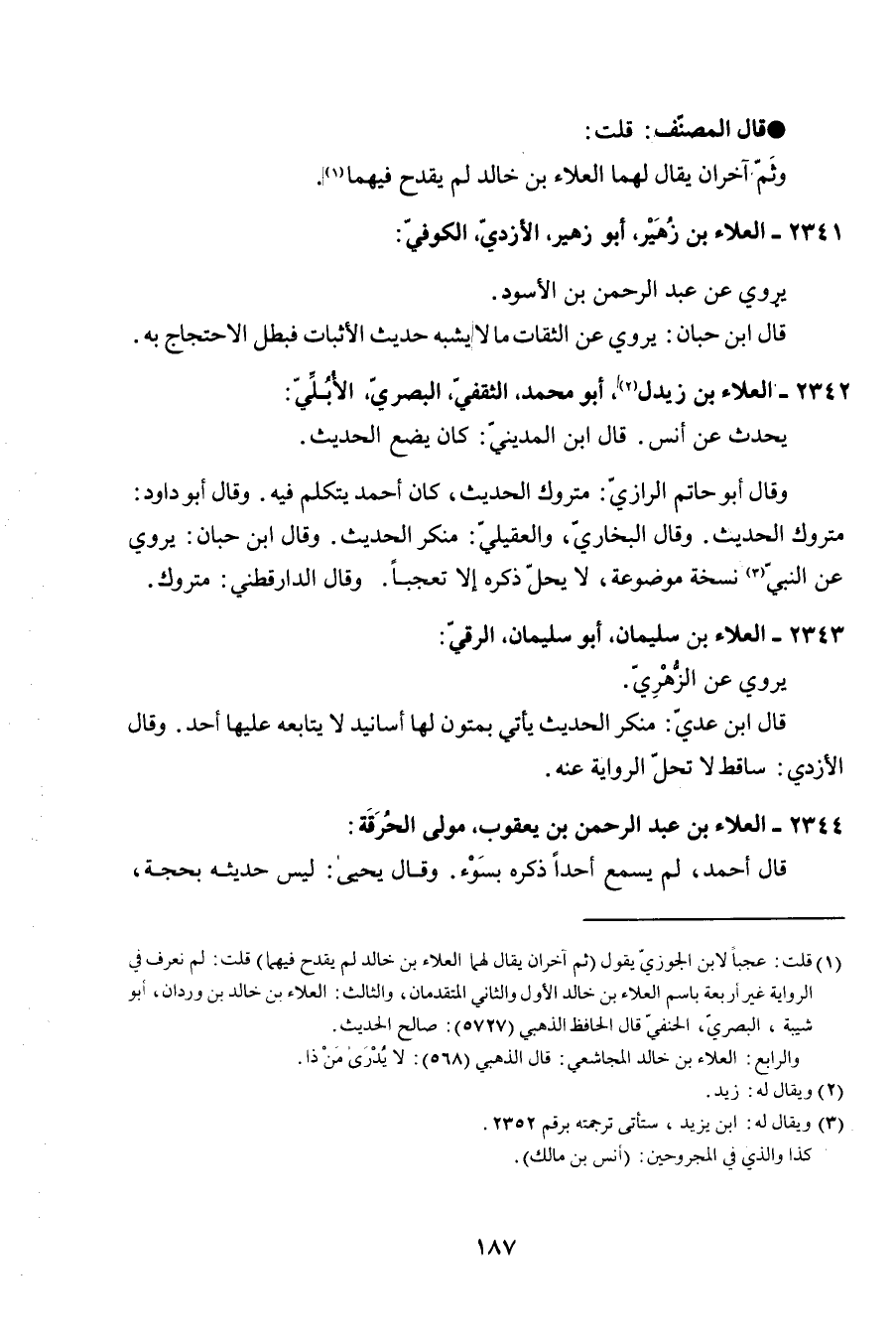 2343 - الْعَلَاء بن سُلَيْمَان أَبُو سُلَيْمَان الرقي يروي عَن الزُّهْرِيّ قَالَ ابْن عدي مُنكر الحَدِيث يَأْتِي بمتون لَهَا أَسَانِيد لَا يُتَابِعه عَلَيْهَا أحد وَقَالَ الْأَزْدِيّ سَاقِط لَا تحل الرِّوَايَة عَنهُ