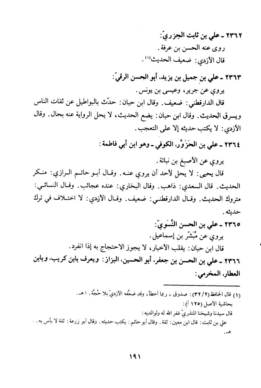 2362 - عَليّ بن ثَابت الْجَزرِي روى عَنهُ الْحسن بن عَرَفَة قَالَ الْأَزْدِيّ ضَعِيف الحَدِيث