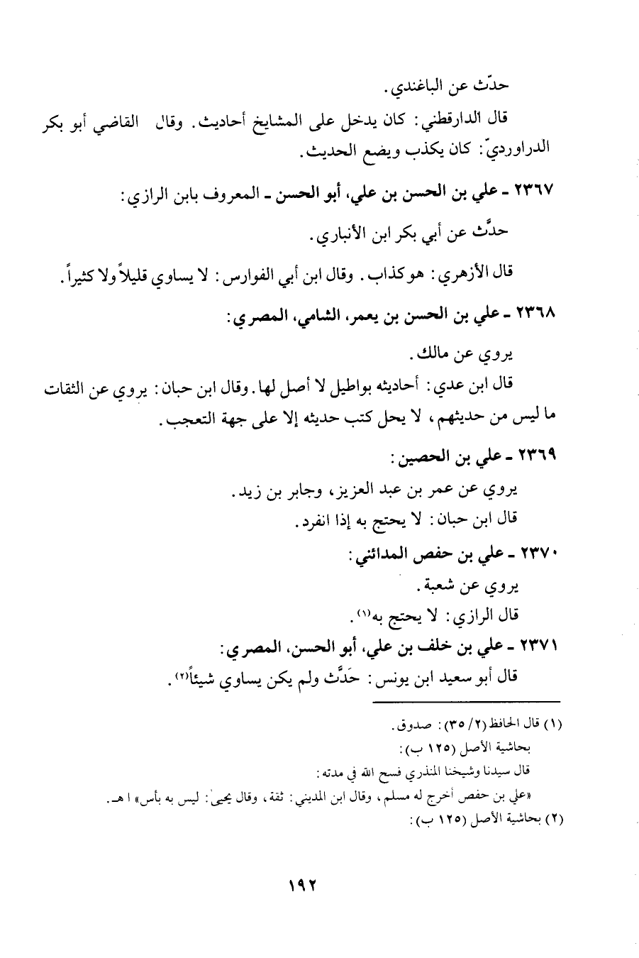 2367 - عَليّ بن الْحسن بن عَليّ أَبُو الْحسن الْمَعْرُوف بِابْن الرَّازِيّ حدث عَن أبي بكر ابْن الْأَنْبَارِي قَالَ الْأَزْهَرِي هُوَ كَذَّاب وَقَالَ ابْن أبي الفوارس لَا يُسَاوِي قَلِيلا وَلَا كثيرا