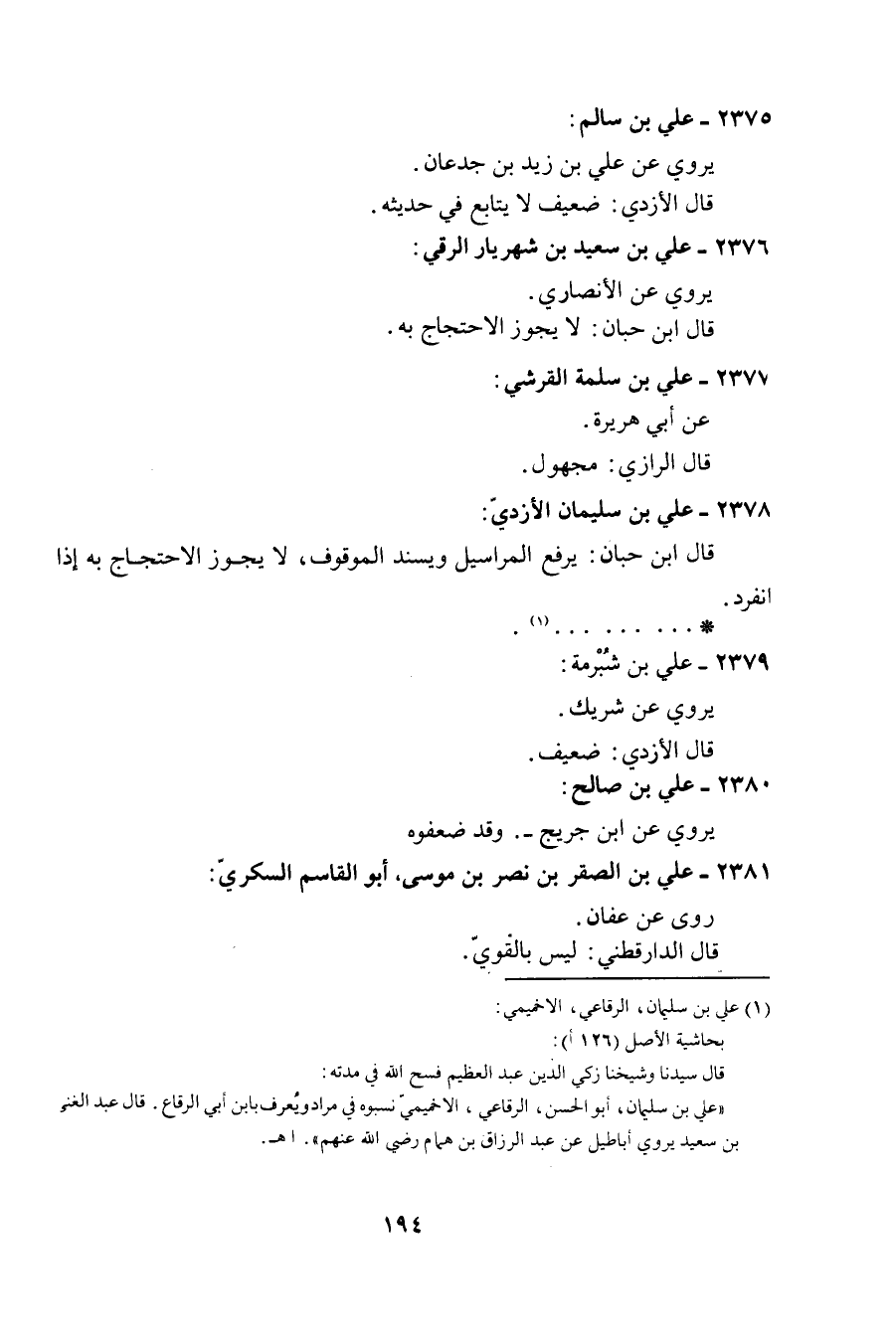 2378 - عَليّ بن سُلَيْمَان الْأَزْدِيّ قَالَ ابْن حبَان يرفع الْمَرَاسِيل ويسند الْمَوْقُوف لَا يجوز الِاحْتِجَاج بِهِ إِذا انْفَرد
