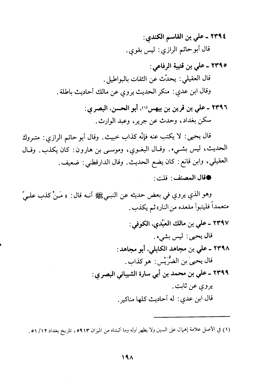 2396 - عَليّ بن قرين بن بيهس أَبُو الْحسن الْبَصْرِيّ سكن بَغْدَاد وَحدث عَن جرير وَعبد الْوَارِث قَالَ يحيى لَا يكْتب عَنهُ فَإِنَّهُ كَذَّاب خَبِيث وَقَالَ أَبُو حَاتِم الرَّازِيّ مَتْرُوك الحَدِيث لَيْسَ بِشَيْء وَقَالَ الْبَغَوِيّ ومُوسَى بن هَارُون كَانَ يكذب وَقَالَ الْعقيلِيّ وَابْن قَانِع كَانَ يضع الحَدِيث وَقَالَ الدَّارَقُطْنِيّ ضَعِيف قَالَ المُصَنّف قلت وَهُوَ الَّذِي يروي فِي بعض حَدِيثه عَن النَّبِي صلى الله عَلَيْهِ وَسلم أَنه قَالَ ((من كذب عَليّ مُتَعَمدا فَليَتَبَوَّأ مَقْعَده من النَّار)) ثمَّ يكذب