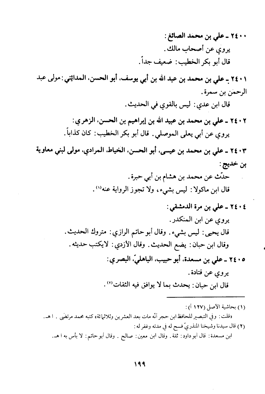2400 - عَليّ بن مُحَمَّد الصَّائِغ يروي عَن أَصْحَاب مَالك قَالَ أَبُو بكر الْخَطِيب ضَعِيف جدا