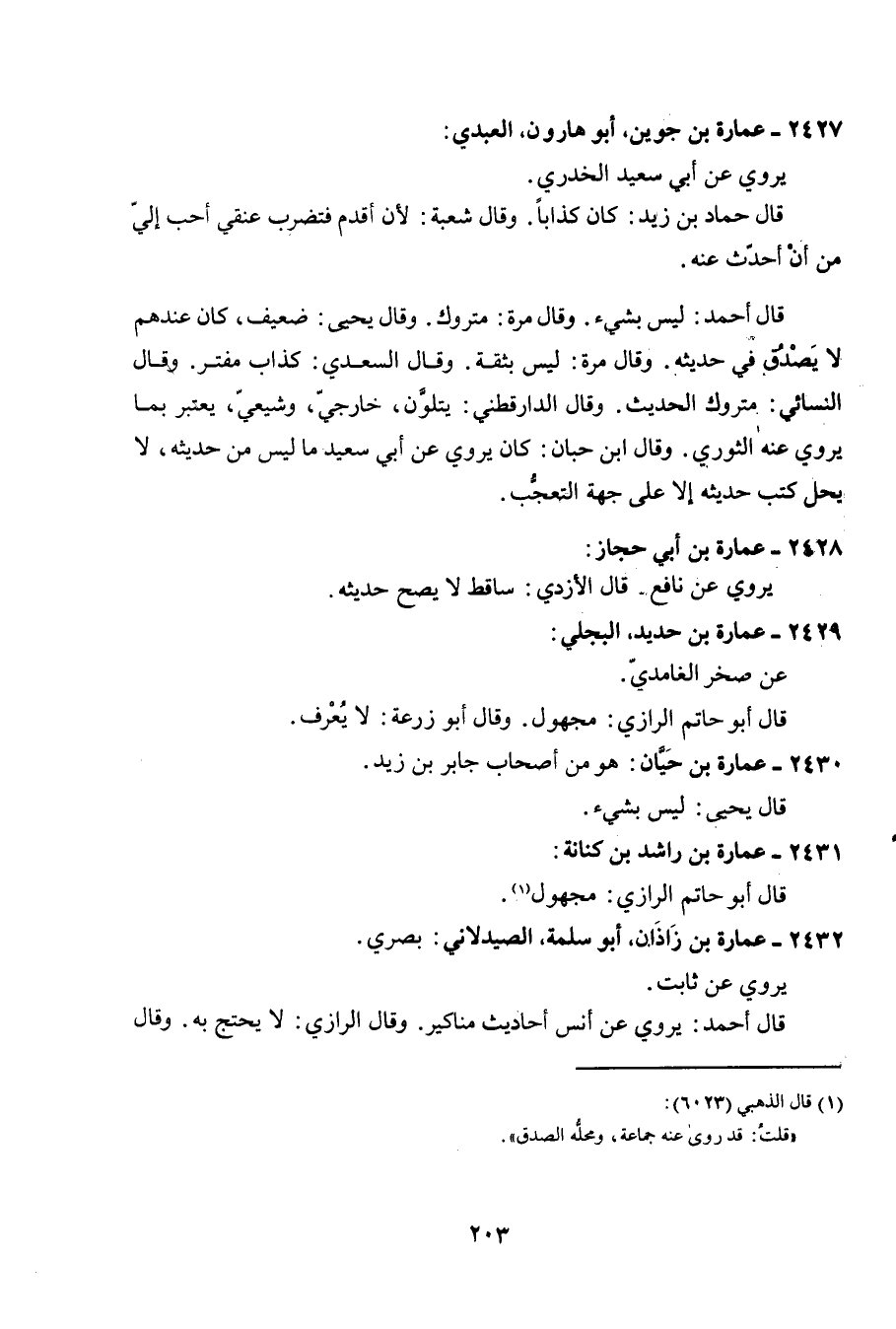 2427 - عمَارَة بن جُوَيْن أَبُو هَارُون الْعَبْدي يروي عَن أبي سعيد الْخُدْرِيّ قَالَ حَمَّاد بن زيد كَانَ كذابا وَقَالَ شُعْبَة لِأَن أقدم فَتضْرب عنقِي أحب إِلَيّ من أَن أحدث عَنهُ قَالَ أَحْمد لَيْسَ بِشَيْء وَقَالَ مرّة مَتْرُوك وَقَالَ يحيى ضَعِيف كَانَ عِنْدهم لَا يصدق فِي حَدِيثه وَقَالَ مرّة لَيْسَ بِثِقَة وَقَالَ السَّعْدِيّ كَذَّاب مفتر وَقَالَ النَّسَائِيّ مَتْرُوك الحَدِيث وَقَالَ الدَّارَقُطْنِيّ يَتلون خارجي وشيعي يعْتَبر بِمَا يروي عَنهُ الثَّوْريّ وَقَالَ ابْن حبَان كَانَ يروي عَن أبي سعيد مَا لَيْسَ من حَدِيثه لَا يحل كتب حَدِيثه إِلَّا على جِهَة التَّعَجُّب يحل كتب حَدِيثه إِلَّا على جِهَة التَّعَجُّب