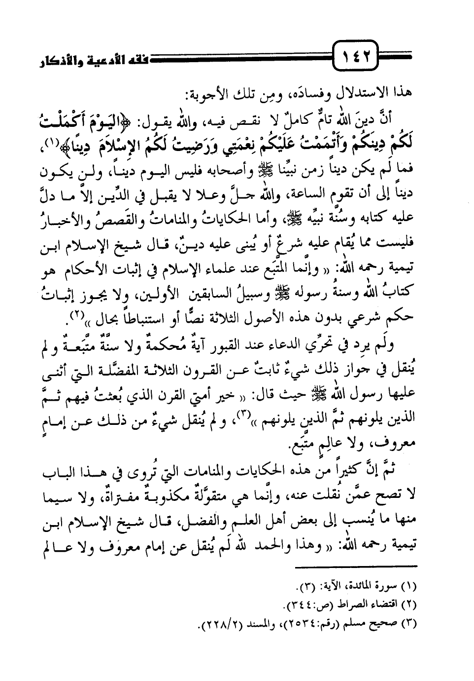 أنَّ دينَ الله تامٌّ كاملٌ لا نقص فيه، والله يقول: {اليَوْمَ أَكْمَلْتُ لَكُمْ دِينَكُمْ وَأَتْمَمْتُ عَلَيْكُمْ نِعْمَتِي وَرَضِيتُ لَكُمُ الإِسْلاَمَ دِينًا} 1، فما لَم يكن ديناً زمن نبيِّنا صلى الله عليه وسلم وأصحابه فليس اليوم ديناً، ولن يكون ديناً إلى أن تقوم الساعة، والله جلَّ وعلا لا يقبل في الدِّين إلاَّ ما دلَّ عليه كتابه وسُنَّة نبيِّه صلى الله عليه وسلم، وأما الحكاياتُ والمناماتُ والقَصصُ والأخبارُ فليست مما يُقام عليه شرعٌ أو يُبنى عليه دينٌ، قال شيخ الإسلام ابن تيمية رحمه الله: " وإنَّما المتَّبَع عند علماء الإسلام في إثبات الأحكام هو كتابُ الله وسنةُ رسوله صلى الله عليه وسلم وسبيلُ السابقين الأولين، ولا يجوز إثباتُ حكم شرعي بدون هذه الأصول الثلاثة نصًّا أو استنباطاً بحال "2.