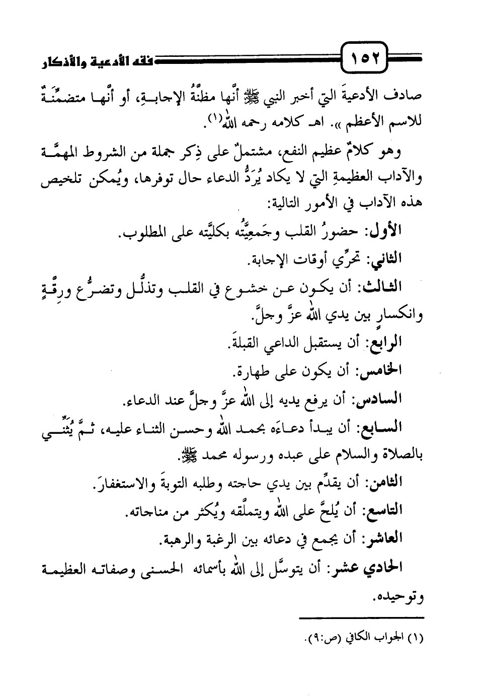 وهو كلامٌ عظيم النفع، مشتملٌ على ذِكر جملة من الشروط المهمَّة والآداب العظيمةِ التي لا يكاد يُرَدُّ الدعاء حال توفرها، ويُمكن تلخيص هذه الآداب في الأمور التالية: