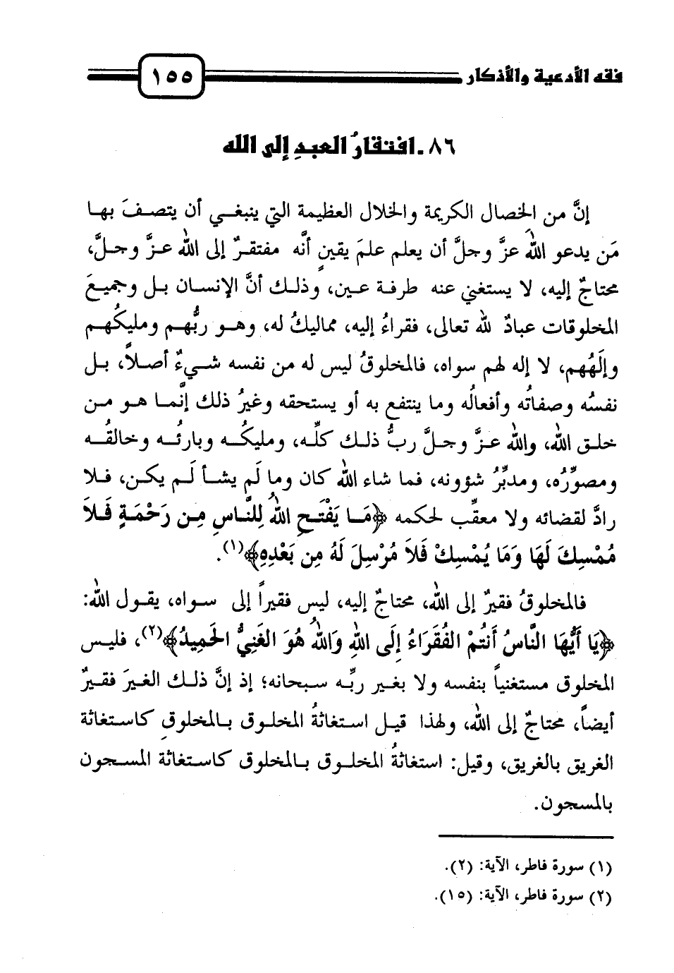 فالمخلوقُ فقيرٌ إلى الله، محتاجٌ إليه، ليس فقيراً إلى سواه، يقول الله: {يَا أَيُّهَا النَّاسُ أَنتُمْ الفُقَرَاءُ إِلَى اللهِ وَاللهُ هُوَ الغَنِيُّ الحَمِيدُ} 2، فليس المخلوق مستغنياً بنفسه ولا بغير ربِّه سبحانه؛ إذ إنَّ ذلك الغيرَ فقيرٌ أيضاً، محتاجٌ إلى الله، ولهذا قيل استغاثةُ المخلوق بالمخلوقِ كاستغاثة الغريق بالغريق، وقيل: استغاثةُ المخلوق بالمخلوق كاستغاثة المسجون بالمسجون.