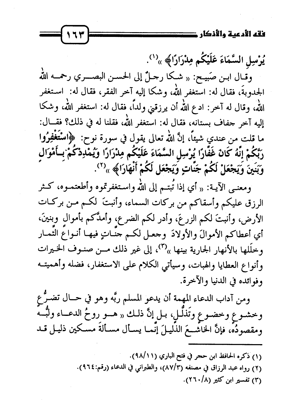 وقال ابن صَبيح: " شكا رجلٌ إلى الحسن البصري رحمه الله الجدوبةَ، فقال له: استغفر الله، وشكا إليه آخر الفقر، فقال له: استغفر الله، وقال له آخر: ادع الله أن يرزقني ولداً، فقال له: استغفر الله، وشكا إليه آخر جفاف بستانه، فقال له: استغفر الله، فقلنا له في ذلك؟ فقال: ما قلت من عندي شيئاً، إنَّ الله تعالى يقول في سورة نوح: {اسْتَغْفِرُوا رَبَّكُمْ إِنَّهُ كَانَ غَفَّارًا يُرْسِلِ السَّمَاءَ عَلَيْكُم مِدْرَارًا وَيُمْدِدْكُمْ بِأَمْوَالٍ وَبَنَينَ وَيَجْعَلْ لَكُمْ جَنَّاتٍ وَيَجْعَل لَكُمْ أَنْهَارَا} " 2.