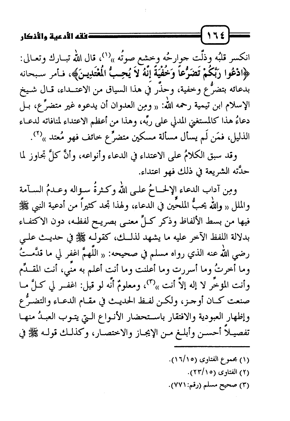 ومِن آداب الدعاء الإلحاحُ على الله وكثرةُ سؤاله وعدمُ السآمة والملل " والله يحبُّ الملحٍّين في الدعاء، ولهذا تجد كثيراً من أدعية النبي صلى الله عليه وسلم فيها من بسط الألفاظ وذكر كلِّ معنى بصريح لفظه، دون الاكتفاء بدلالة اللفظ الآخر عليه ما يشهد لذلك، كقوله صلى الله عليه وسلم في حديث علي رضي الله عنه الذي رواه مسلم في صحيحه: " اللَّهمَّ اغفر لي ما قدَّمتُ وما أخرتُ وما أسررت وما أعلنت وما أنت أعلم به منِّي، أنت المقدِّم وأنت المؤخِّر لا إله إلاَّ أنت "3، ومعلومٌ أنَّه لو قيل: اغفر لي كلَّ ما صنعت كان أوجز، ولكن لفظ الحديث في مقام الدعاء والتضرُّع وإظهار العبودية والافتقار باستحضار الأنواع التي يتوب العبدُ منها تفصيلاً أحسن وأبلغ من الإيجاز والاختصار، وكذلك قوله صلى الله عليه وسلم في