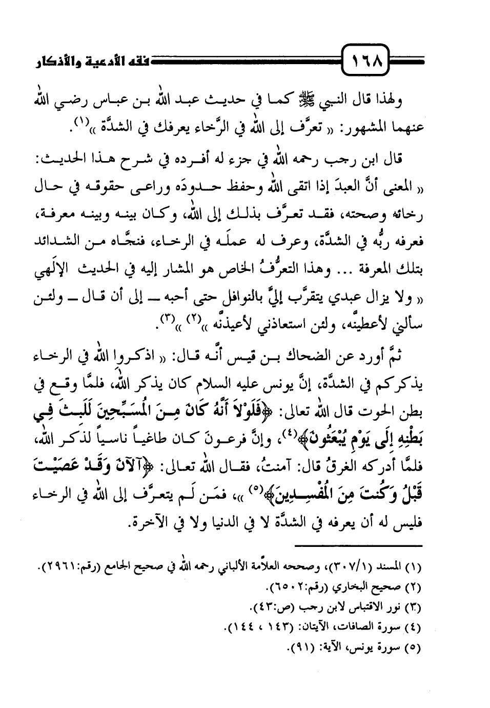 ثمَّ أورد عن الضحاك بن قيس أنَّه قال: " اذكروا الله في الرخاء يذكركم في الشدَّة، إنَّ يونس عليه السلام كان يذكر اللهَ، فلمَّا وقع في بطن الحوت قال الله تعالى: {فَلَوْلاَ أَنَّهُ كَانَ مِنَ المُسَبِّحِينَ لَلَبِثَ فِي بَطْنِهِ إِلَى يَوْمِ يُبْعَثُونَ} 4، وإنَّ فرعونَ كان طاغياً ناسياً لذكر الله، فلمَّا أدركه الغرقُ قال: آمنتُ، فقال الله تعالى: {آلآنَ وَقَدْ عَصَيْتَ قَبْلُ وَكُنتَ مِنَ المُفْسِدِينَ} 5 "، فمَن لَم يتعرَّف إلى الله في الرخاء فليس له أن يعرفه في الشدَّة لا في الدنيا ولا في الآخرة.