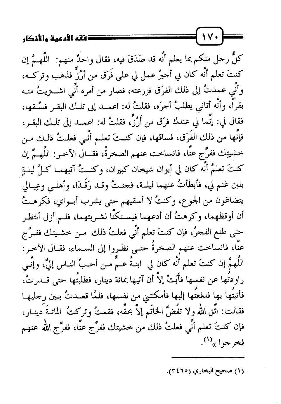 كلُّ رجل منكم بما يعلم أنَّه قد صَدَقَ فيه، فقال واحدٌ منهم: اللَّهمَّ إن كنتَ تعلم أنَّه كان لي أجيرٌ عمل لي على فَرَق من أرُزٍّ فذهب وتركه، وأنِّي عمدتُ إلى ذلك الفرَق فزرعته، فصار من أمره أنِّي اشتريتُ منه بقراً، وأنَّه أتاني يطلبُ أجرَه، فقلتُ له: اعمد إلى تلك البقر فسُقها، فقال لي: إنَّما لي عندك فرَق من أَرُزٍّ، فقلتُ له: اعمد إلى تلك البقر، فإنَّها من ذلك الفَرَق، فساقها، فإن كنتَ تعلم أنِّي فعلتُ ذلك من خشيتِك ففرِّج عنَّا، فانساخت عنهم الصخرةُ، فقال الآخر: اللَّهمَّ إن كنتَ تعلمُ أنَّه كان لي أبوان شيخان كبيران، وكنتُ آتيهما كلَّ ليلةٍ بلبن غنم لي، فأبطأتُ عنهما ليلة، فجئتُ وقد رَقَدَا، وأهلي وعِيالي يتضاغون من الجوع، وكنتُ لا أسقيهم حتى يشرب أبواي، فكرهتُ أن أوقظهما، وكرهتُ أن أدعهما فيستكنَّا لشربتهما، فلم أزل أنتظر حتى طلع الفجرُ، فإن كنتَ تعلم أنِّي فعلتُ ذلك من خشيتك ففرِّج عنَّا، فانساخت عنهم الصخرةُ حتى نظروا إلى السماء، فقال الآخر: اللَّهمَّ إن كنتَ تعلم أنَّه كان لي ابنةُ عمٍّ من أحبِّ الناس إليَّ، وإنِّي راودتُها عن نفسها فأَبَتْ إلاَّ أن آتيها بمائة دينار، فطلبتُها حتى قدرتُ، فأتيتُها بها فدفعتُها إليها فأمكنتني من نفسها، فلمَّا قعدتُ بين رِجليها فقالت: اتَّق الله ولا تفُضَّ الخاتَم إلاَّ بحقِّه، فقمتُ وتركتُ المائةَ دينار، فإن كنتَ تعلم أنِّي فعلتُ ذلك من خشيتك ففرِّج عنَّا، ففرَّج الله عنهم فخرجوا "1.