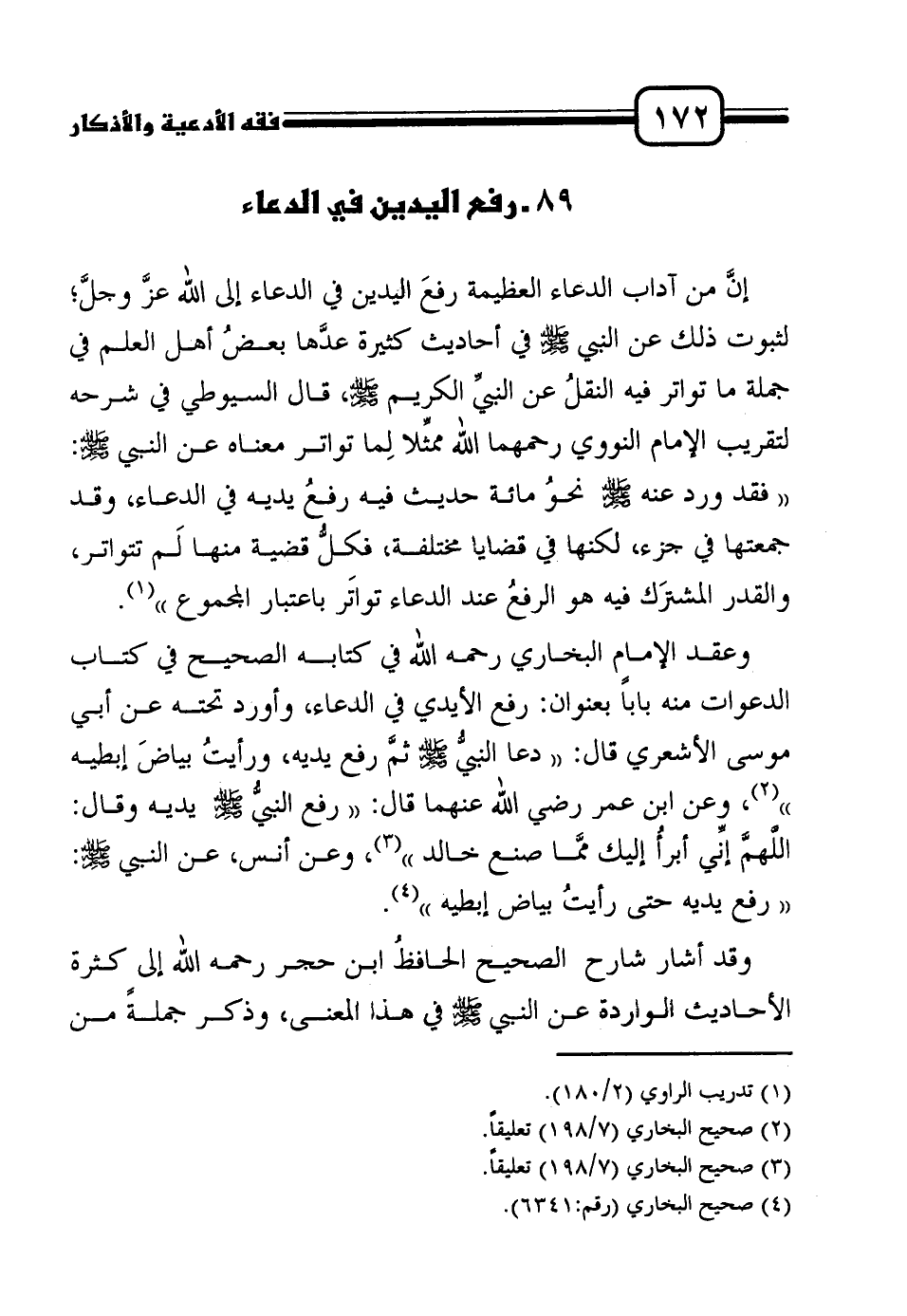 وعقد الإمام البخاري رحمه الله في كتابه الصحيح في كتاب الدعوات منه باباً بعنوان: رفع الأيدي في الدعاء، وأورد تحته عن أبي موسى الأشعري قال: " دعا النبيُّ صلى الله عليه وسلم ثمَّ رفع يديه، ورأيتُ بياضَ إبطيه "2، وعن ابن عمر رضي الله عنهما قال: " رفع النبيُّ صلى الله عليه وسلم يديه وقال: اللَّهمَّ إنِّي أبرأُ إليك ممَّا صنع خالد "3، وعن أنس، عن النبي صلى الله عليه وسلم: " رفع يديه حتى رأيتُ بياض إبطيه "4.