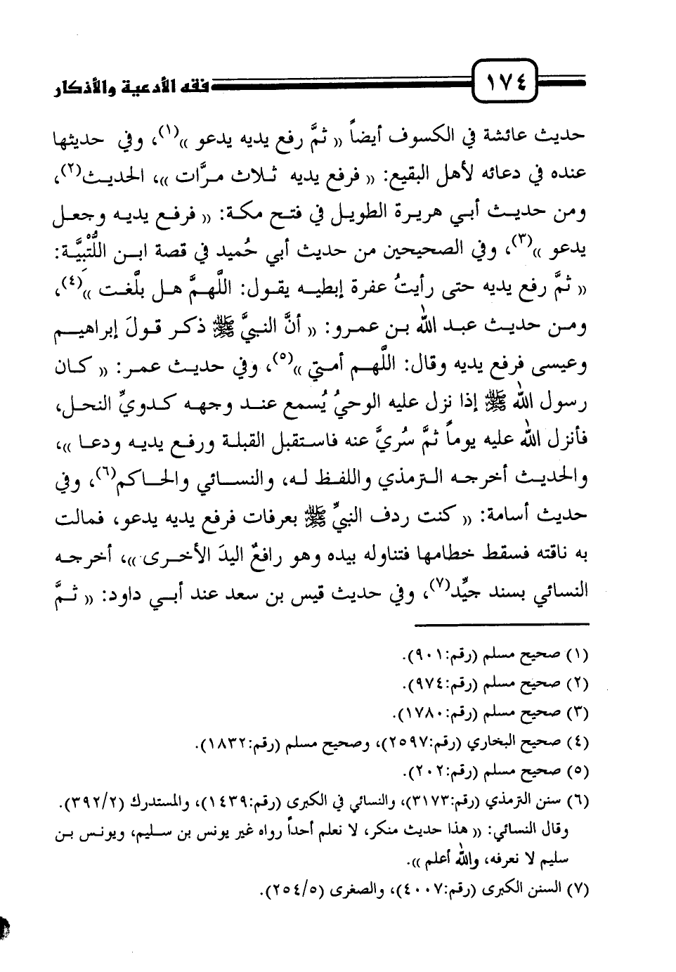حديث عائشة في الكسوف أيضاً " ثمَّ رفع يديه يدعو "1، وفي حديثها عنده في دعائه لأهل البقيع: " فرفع يديه ثلاث مرَّات "، الحديث2، ومن حديث أبي هريرة الطويل في فتح مكة: " فرفع يديه وجعل يدعو "3، وفي الصحيحين من حديث أبي حُميد في قصة ابن اللُّتْبِيَّة: " ثمَّ رفع يديه حتى رأيتُ عفرة إبطيه يقول: اللَّهمَّ هل بلَّغت "4، ومن حديث عبد الله بن عمرو: " أنَّ النبيَّ صلى الله عليه وسلم ذكر قولَ إبراهيم وعيسى فرفع يديه وقال: اللَّهم أمتي "5، وفي حديث عمر: " كان رسول الله صلى الله عليه وسلم إذا نزل عليه الوحيُ يُسمع عند وجهه كدويِّ النحل، فأنزل الله عليه يوماً ثمَّ سُريَّ عنه فاستقبل القبلة ورفع يديه ودعا "، والحديث أخرجه الترمذي واللفظ له، والنسائي والحاكم6، وفي حديث أسامة: " كنت ردف النبيِّ صلى الله عليه وسلم بعرفات فرفع يديه يدعو، فمالت به ناقته فسقط خطامها فتناوله بيده وهو رافعٌ اليدَ الأخرى "، أخرجه النسائي بسند جيِّد7، وفي حديث قيس بن سعد عند أبي داود: " ثمَّ