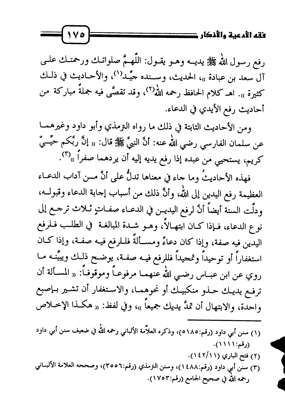 رفع رسول الله صلى الله عليه وسلم يديه وهو يقول: اللَّهمَّ صلواتك ورحمتك على آل سعد بن عبادة "، الحديث، وسنده جيِّد1، والأحاديث في ذلك كثيرة ". اهـ كلام الحافظ رحمه الله2، وقد تقصَّى فيه جملةً مباركة من أحاديث رفع الأيدي في الدعاء.
