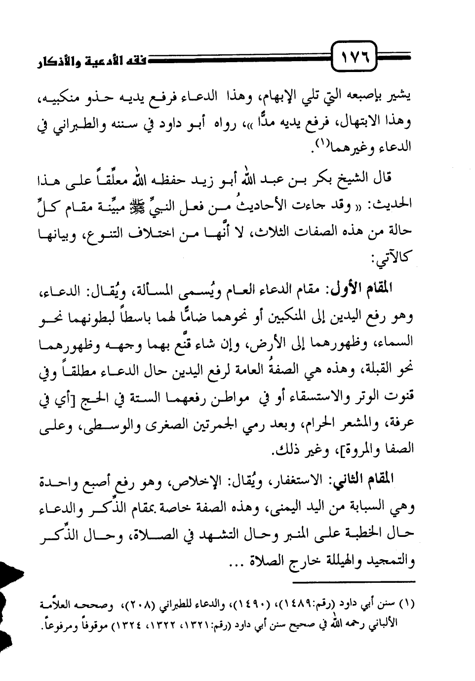 المقام الأول: مقام الدعاء العام ويُسمى المسألة، ويُقال: الدعاء، وهو رفع اليدين إلى المنكبين أو نحوهما ضامًّا لهما باسطاً لبطونهما نحو السماء، وظهورهما إلى الأرض، وإن شاء قنَّع بهما وجهه وظهورهما نحو القبلة، وهذه هي الصفةُ العامة لرفع اليدين حال الدعاء مطلقاً وفي قنوت الوتر والاستسقاء أو في مواطن رفعهما الستة في الحج [أي في عرفة، والمشعر الحرام، وبعد رمي الجمرتين الصغرى والوسطى، وعلى الصفا والمروة] ، وغير ذلك.