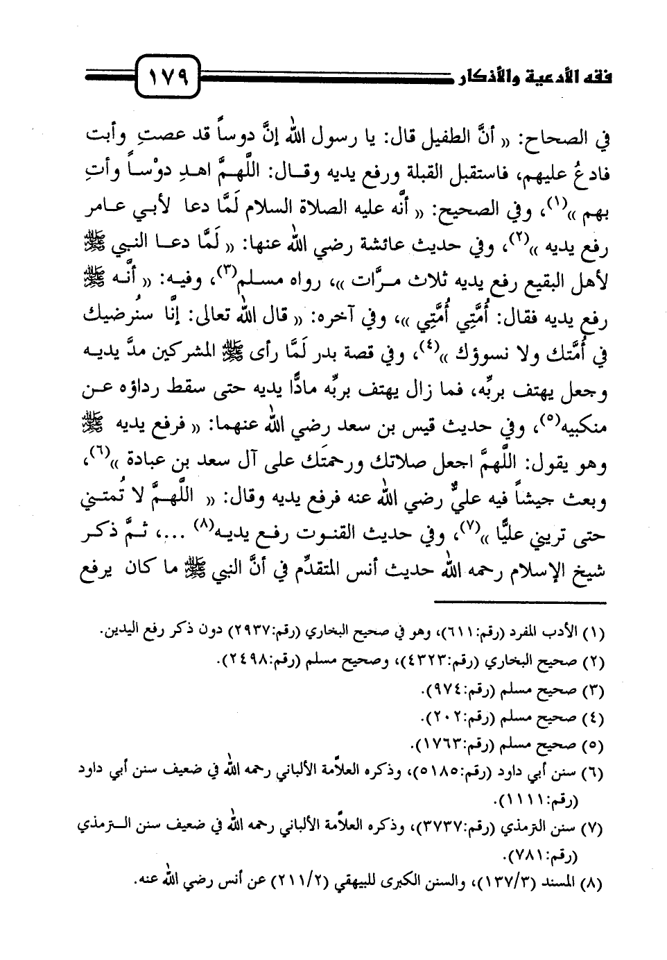 في الصحاح: " أنَّ الطفيل قال: يا رسول الله إنَّ دوساً قد عصتِ وأبت فادعُ عليهم، فاستقبل القبلة ورفع يديه وقال: اللَّهمَّ اهدِ دوْساً وأتِ بهم "1، وفي الصحيح: " أنَّه عليه الصلاة السلام لَمَّا دعا لأبي عامر رفع يديه "2، وفي حديث عائشة رضي الله عنها: " لَمَّا دعا النبي صلى الله عليه وسلم لأهل البقيع رفع يديه ثلاث مرَّات "، رواه مسلم3، وفيه: " أنَّه صلى الله عليه وسلم رفع يديه فقال: أُمَّتِي أُمَّتِي "، وفي آخره: " قال الله تعالى: إنَّا سنُرضيك في أُمَّتك ولا نسوؤك "4، وفي قصة بدر لَمَّا رأى صلى الله عليه وسلم المشركين مدَّ يديه وجعل يهتف بربِّه، فما زال يهتف بربِّه مادًّا يديه حتى سقط رداؤه عن منكبيه5، وفي حديث قيس بن سعد رضي الله عنهما: " فرفع يديه صلى الله عليه وسلم وهو يقول: اللَّهمَّ اجعل صلاتك ورحمتَك على آل سعد بن عبادة "6، وبعث جيشاً فيه عليٌّ رضي الله عنه فرفع يديه وقال: " اللَّهمَّ لا تُمتني حتى تريني عليًّا "7، وفي حديث القنوت رفع يديه8 ... ، ثمَّ ذكر شيخ الإسلام رحمه الله حديث أنس المتقدِّم في أنَّ النبي صلى الله عليه وسلم ما كان يرفع