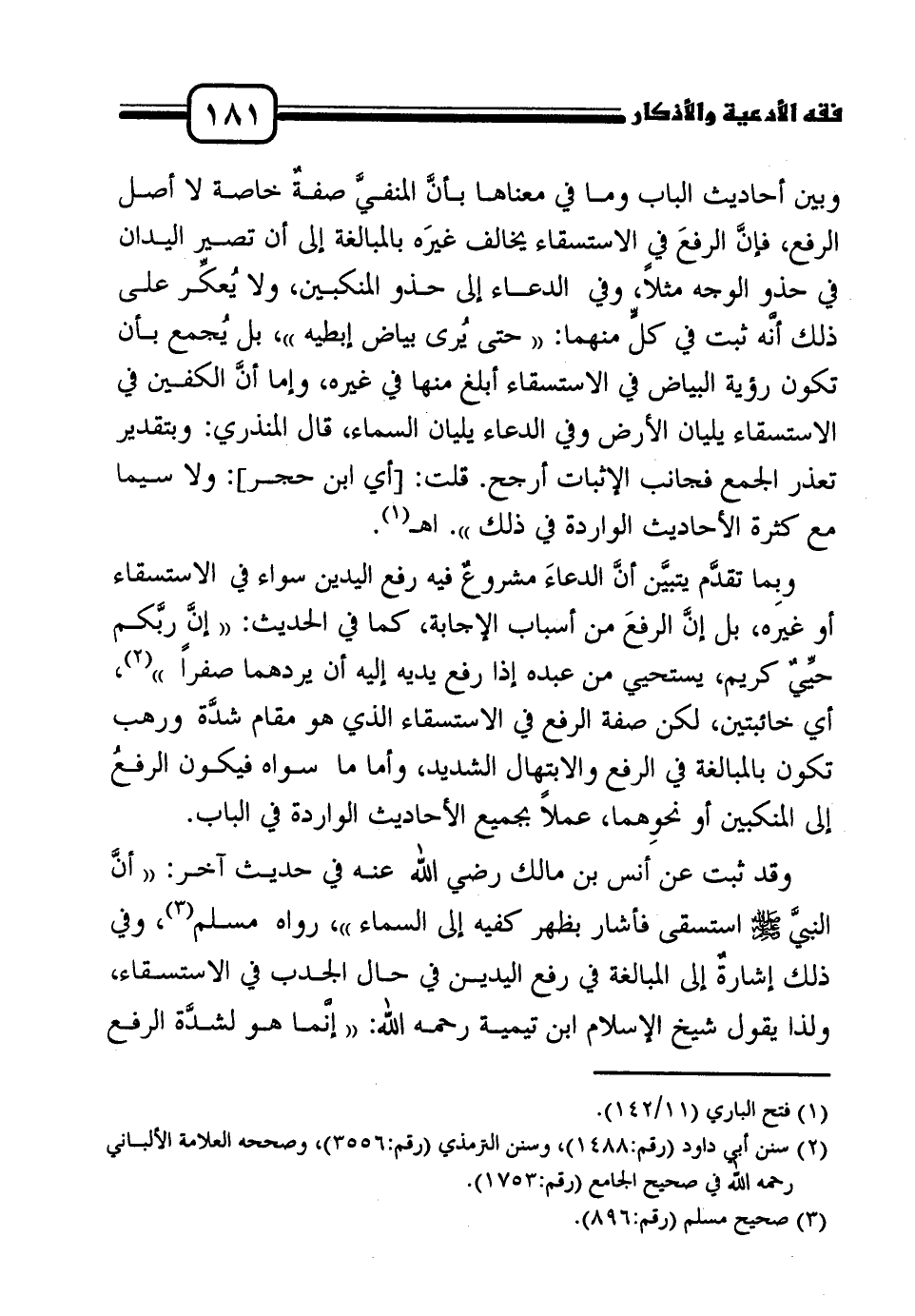وبِما تقدَّم يتبيَّن أنَّ الدعاءَ مشروعٌ فيه رفع اليدين سواء في الاستسقاء أو غيره، بل إنَّ الرفعَ من أسباب الإجابة، كما في الحديث: " إنَّ ربَّكم حيِّيٌ كريم، يستحيي من عبده إذا رفع يديه إليه أن يردهما صفراً "2، أي خائبتين، لكن صفة الرفع في الاستسقاء الذي هو مقام شدَّة ورهب تكون بالمبالغة في الرفع والابتهال الشديد، وأما ما سواه فيكون الرفعُ إلى المنكبين أو نحوِهما، عملاً بجميع الأحاديث الواردة في الباب.