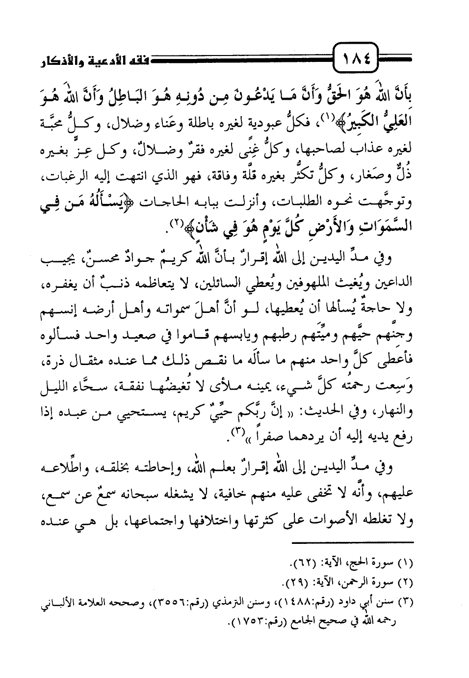 وفي مدِّ اليدين إلى الله إقرارٌ بعلم الله، وإحاطته بخلقه، واطِّلاعه عليهم، وأنَّه لا تخفى عليه منهم خافية، لا يشغله سبحانه سمعٌ عن سمع، ولا تغلطه الأصوات على كثرتها واختلافها واجتماعها، بل هي عنده
