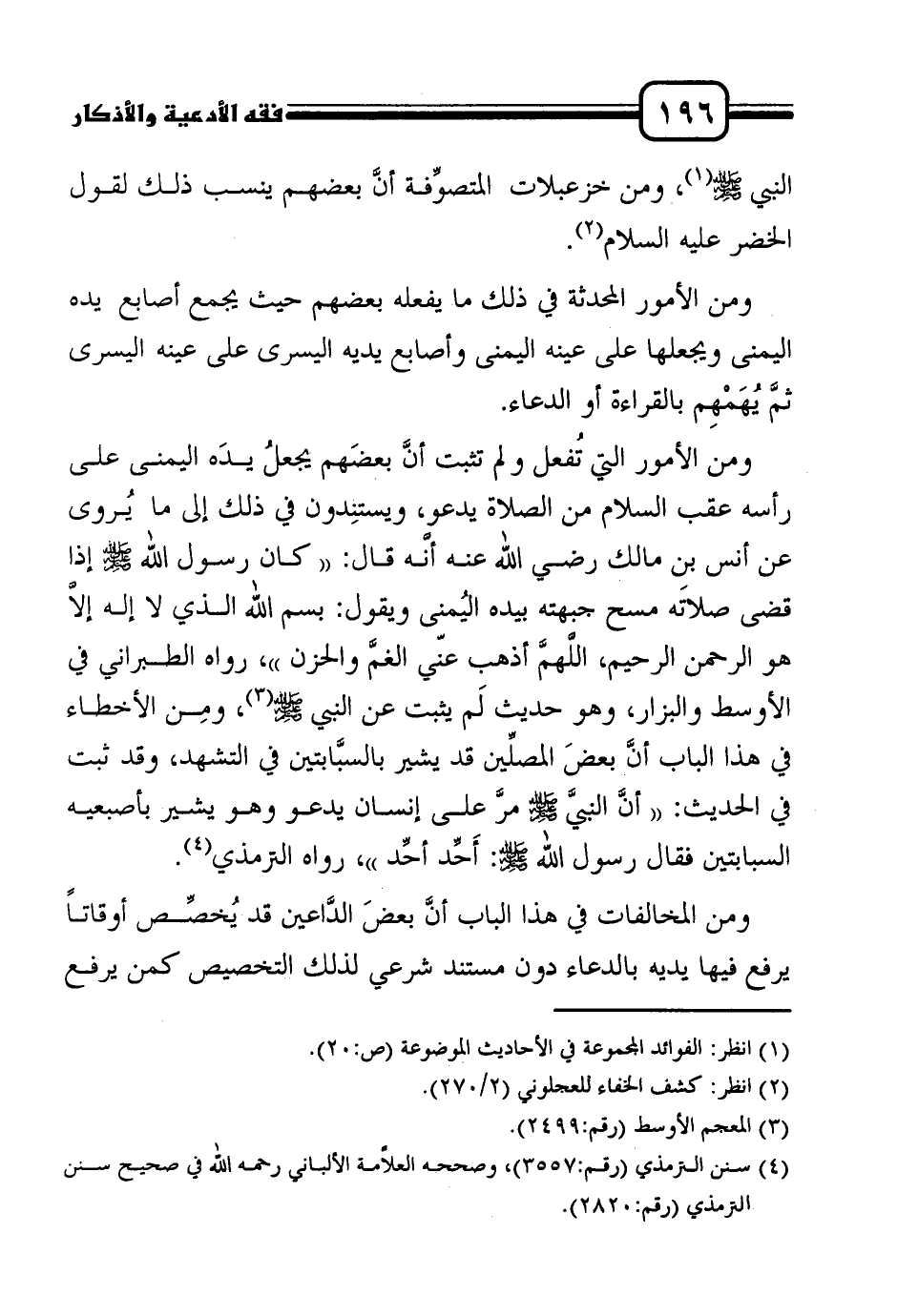 ومن الأمور التي تُفعل ولم تثبت أنَّ بعضَهم يجعلُ يدَه اليمنى على رأسه عقب السلام من الصلاة يدعو، ويستنِدون في ذلك إلى ما يُروى عن أنس بن مالك رضي الله عنه أنَّه قال: " كان رسول الله صلى الله عليه وسلم إذا قضى صلاتَه مسح جبهته بيده اليُمنى ويقول: بسم الله الذي لا إله إلاَّ هو الرحمن الرحيم، اللَّهمَّ أذهب عنّي الغمَّ والحزن "، رواه الطبراني في الأوسط والبزار، وهو حديث لَم يثبت عن النبي صلى الله عليه وسلم3، ومِن الأخطاء في هذا الباب أنَّ بعضَ المصلِّين قد يشير بالسبَّابتين في التشهد، وقد ثبت في الحديث: " أنَّ النبيَّ صلى الله عليه وسلم مرَّ على إنسان يدعو وهو يشير بأصبعيه السبابتين فقال رسول الله صلى الله عليه وسلم: أَحِّد أحِّد "، رواه الترمذي4.