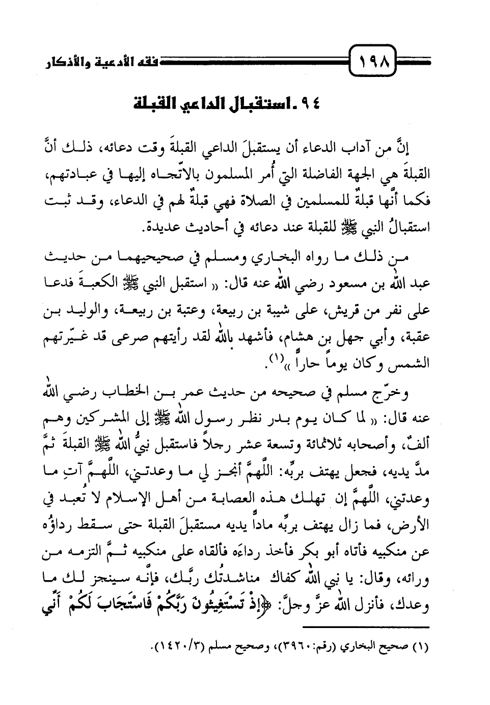 وخرّج مسلم في صحيحه من حديث عمر بن الخطاب رضي الله عنه قال: " لما كان يوم بدر نظر رسول الله صلى الله عليه وسلم إلى المشركين وهم ألفٌ، وأصحابه ثلاثمائة وتسعة عشر رجلاً فاستقبل نبيُّ الله صلى الله عليه وسلم القبلةَ ثمَّ مدَّ يديه، فجعل يهتف بربِّه: اللَّهمَّ أنجز لي ما وعدتني، اللَّهمَّ آتِ ما وعدتني، اللَّهمَّ إن تهلك هذه العصابة من أهل الإسلام لا تُعبد في الأرض، فما زال يهتف بربِّه ماداًّ يديه مستقبلَ القبلة حتى سقط رداؤُه عن منكبيه فأتاه أبو بكر فأخذ رداءَه فألقاه على منكبيه ثمَّ التزمه من ورائه، وقال: يا نبي الله كفاك مناشدتُك ربَّك، فإنَّه سينجز لك ما وعدك، فأنزل الله عزَّ وجلَّ: {إِذْ تَسْتَغِيثُونَ رَبَّكُمْ فَاسْتَجَابَ لَكُمْ أَنِّي