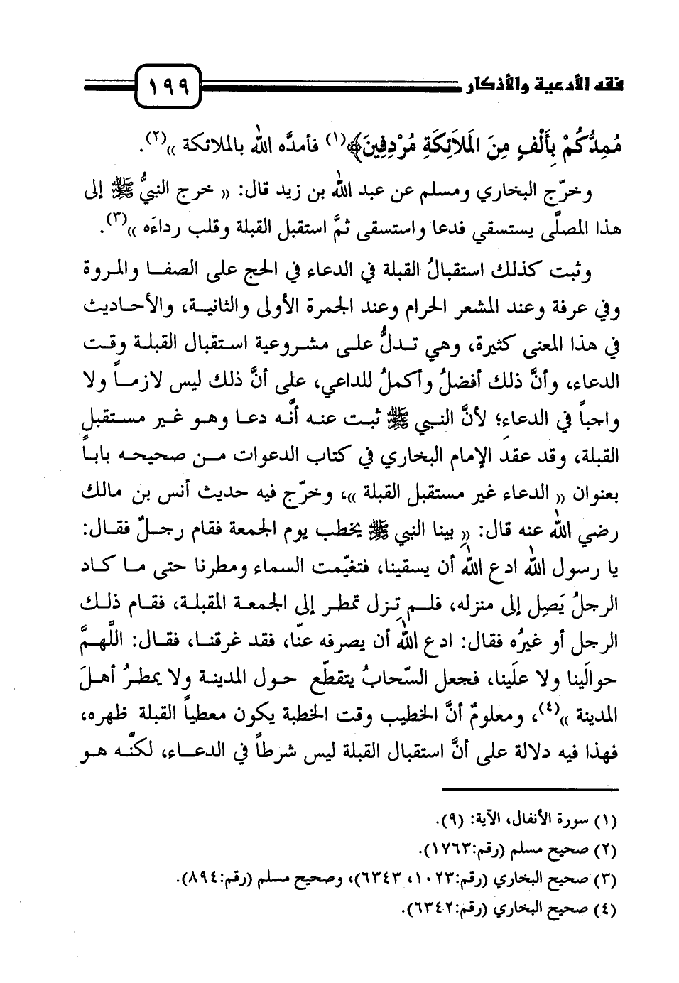 وثبت كذلك استقبالُ القبلة في الدعاء في الحج على الصفا والمروة وفي عرفة وعند المشعر الحرام وعند الجمرة الأولى والثانية، والأحاديث في هذا المعنى كثيرة، وهي تدلُّ على مشروعية استقبال القبلة وقت الدعاء، وأنَّ ذلك أفضلُ وأكملُ للداعي، على أنَّ ذلك ليس لازماً ولا واجباً في الدعاءِ؛ لأنَّ النبي صلى الله عليه وسلم ثبت عنه أنَّه دعا وهو غير مستقبل القبلة، وقد عقد الإمام البخاري في كتاب الدعوات من صحيحه باباً بعنوان " الدعاء غير مستقبل القبلة "، وخرّج فيه حديث أنس بن مالك رضي الله عنه قال: " بينا النبي صلى الله عليه وسلم يخطب يوم الجمعة فقام رجلٌ فقال: يا رسول الله ادع اللهَ أن يسقينا، فتغيّمت السماء ومطرنا حتى ما كاد الرجلُ يَصِل إلى منزله، فلم تزل تمطر إلى الجمعة المقبلة، فقام ذلك الرجل أو غيرُه فقال: ادع اللهَ أن يصرفه عنّا، فقد غرقنا، فقال: اللَّهمَّ حوالَينا ولا علَينا، فجعل السّحابُ يتقطّع حول المدينة ولا يمطرُ أهلَ المدينة "4، ومعلومٌ أنَّ الخطيب وقت الخطبة يكون معطياً القبلة ظهره، فهذا فيه دلالة على أنَّ استقبال القبلة ليس شرطاً في الدعاء، لكنَّه هو