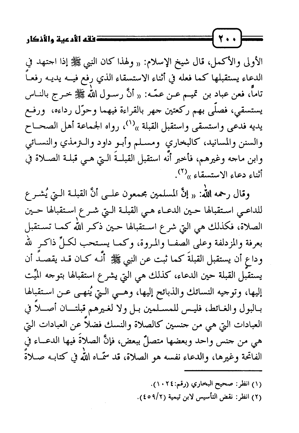 وقال رحمه الله: " إنَّ المسلمين مجمعون على أنَّ القبلة التي يُشرع للداعي استقبالها حين الدعاء هي القبلة التي شرع استقبالها حين الصلاة، فكذلك هي التي شرع استقبالها حين ذكر الله كما تستقبل بعرفة والمزدلفة وعلى الصفا والمروة، وكما يستحب لكلِّ ذاكرٍ لله وداعٍ أن يستقبل القبلةَ كما ثبت عن النبي صلى الله عليه وسلم أنَّه كان قد يقصد أن يستقبل القبلة حين الدعاء، كذلك هي التي يشرع استقبالها بتوجه الميِّت إليها، وتوجيه النسائك والذبائح إليها، وهي التي يُنهى عن استقبالها بالبول والغائط، فليس للمسلمين بل ولا لغيرهم قبلتان أصلاً في العبادات التي هي من جنسين كالصلاة والنسك فضلاً عن العبادات التي هي من جنس واحد وبعضها متصلٌ ببعض، فإنَّ الصلاةَ فيها الدعاء في الفاتحة وغيرها، والدعاء نفسه هو الصلاة، قد سمّاه الله في كتابه صلاةً