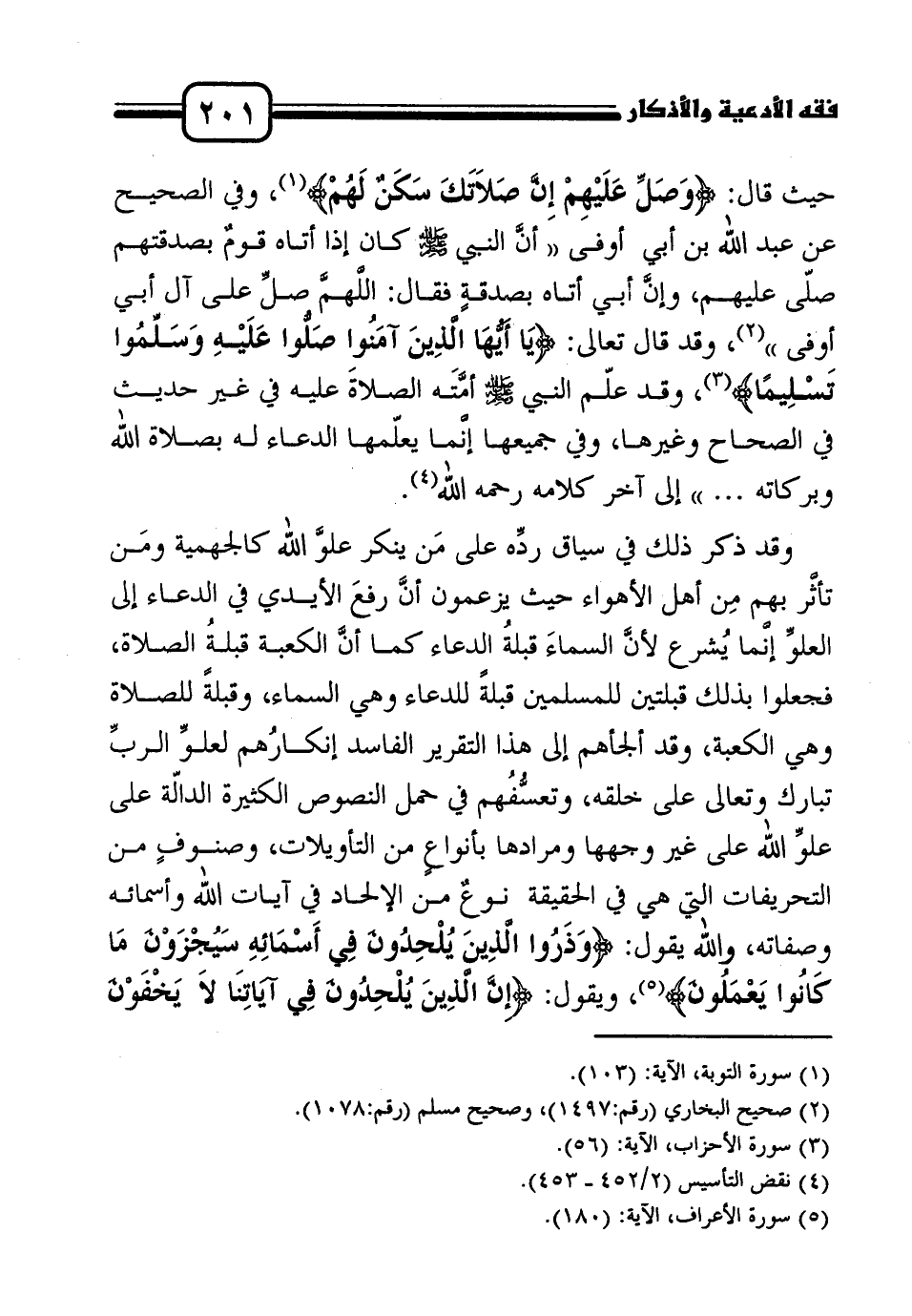 حيث قال: {وَصَلِّ عَلَيْهِمْ إِنَّ صَلاَتَكَ سَكَنٌ لَهُمْ} 1، وفي الصحيح عن عبد الله بن أبي أوفى " أنَّ النبي صلى الله عليه وسلم كان إذا أتاه قومٌ بصدقتهم صلّى عليهم، وإنَّ أبي أتاه بصدقةٍ فقال: اللَّهمَّ صلِّ على آل أبي أوفى "2، وقد قال تعالى: {يَا أَيُّهَا الَّذِينَ آمَنُوا صَلُّوا عَلَيْهِ وَسَلِّمُوا تَسْلِيمًا} 3، وقد علّم النبي صلى الله عليه وسلم أمَّتَه الصلاةَ عليه في غير حديث في الصحاح وغيرها، وفي جميعها إنَّما يعلّمها الدعاء له بصلاة الله وبركاته ... " إلى آخر كلامه رحمه الله4.