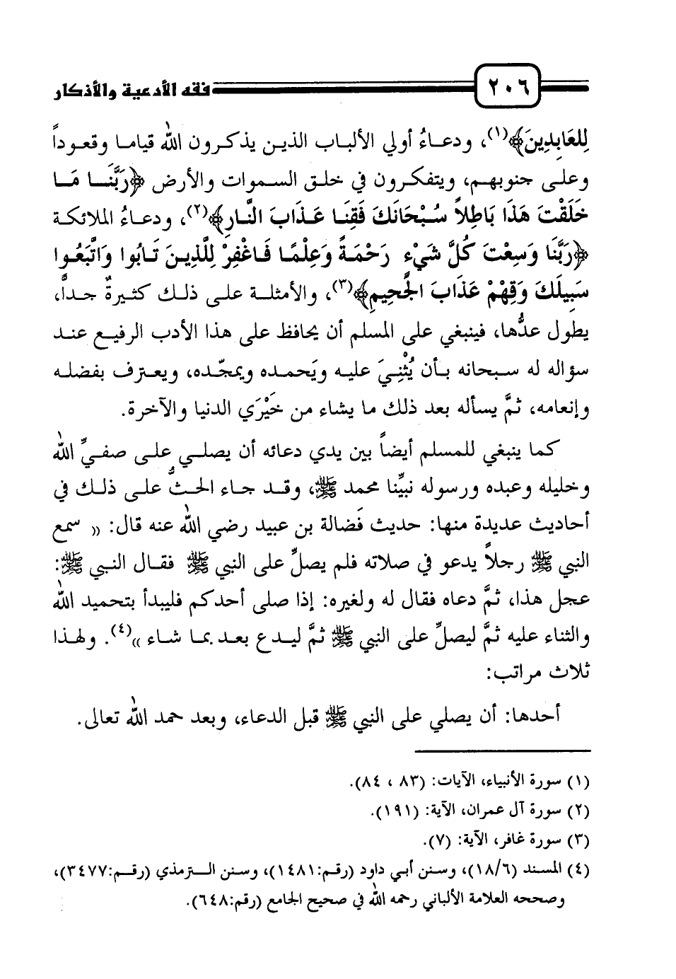 لِلعَابِدِينَ} 1، ودعاءُ أولي الألباب الذين يذكرون الله قياما وقعوداً وعلى جنوبهم، ويتفكرون في خلق السموات والأرض {رَبَّنَا مَا خَلَقْتَ هَذَا بَاطِلاً سُبْحَانَكَ فَقِنَا عَذَابَ النَّارِ} 2، ودعاءُ الملائكة {رَبَّنَا وَسِعْتَ كُلَّ شَيْءٍ رَحْمَةً وَعِلْمًا فَاغْفِرْ لِلَّذِينَ تَابُوا وَاتَّبَعُوا سَبِيلَكَ وَقِهْمْ عَذَابَ الجَحِيمِ} 3، والأمثلة على ذلك كثيرةٌ جداًّ، يطول عدُّها، فينبغي على المسلم أن يحافظ على هذا الأدب الرفيع عند سؤاله له سبحانه بأن يُثْنِيَ عليه ويَحمده ويمجّده، ويعترف بفضله وإنعامه، ثمَّ يسأله بعد ذلك ما يشاء من خَيْرَي الدنيا والآخرة.