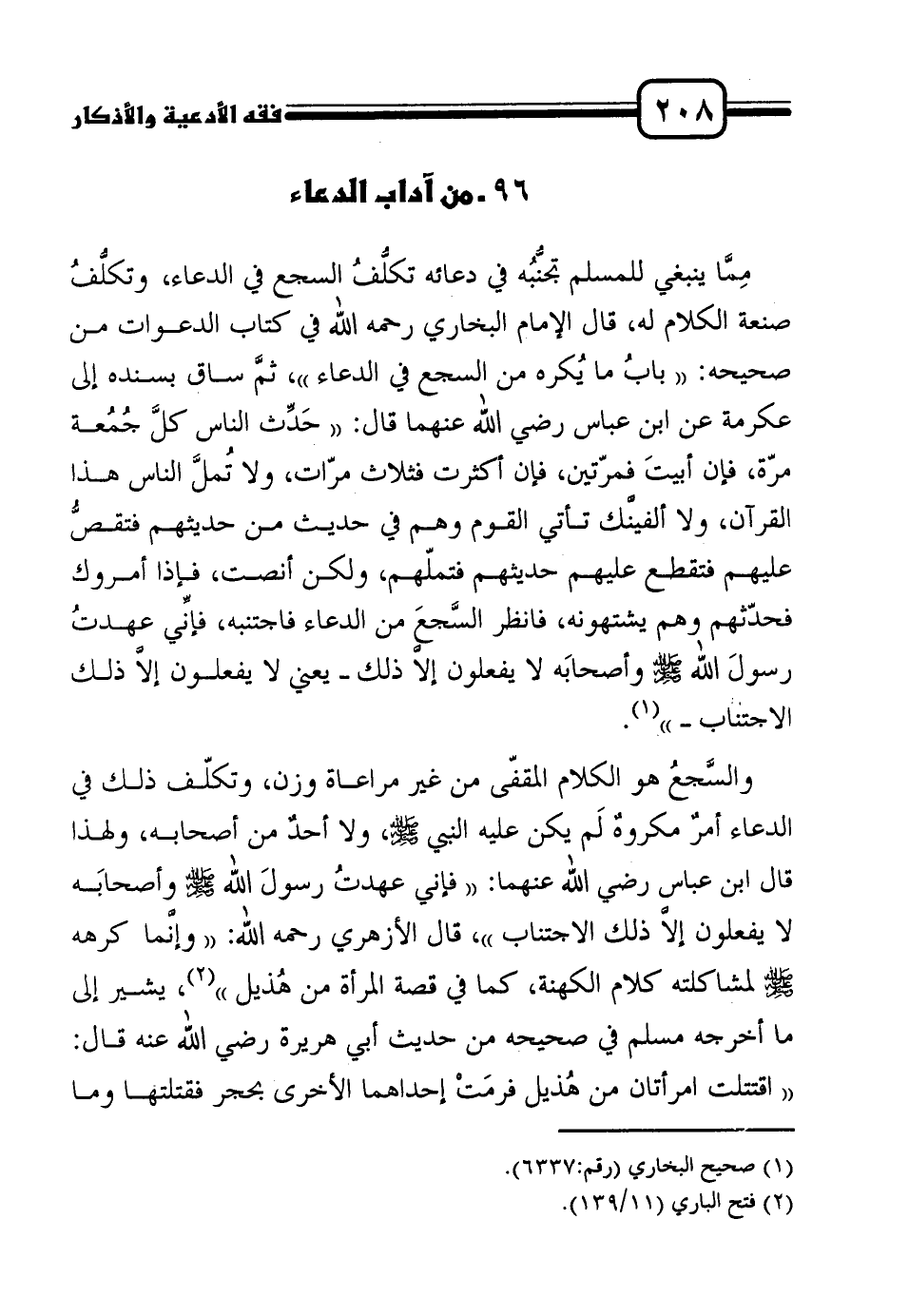 والسَّجعُ هو الكلام المقفّى من غير مراعاة وزن، وتكلّف ذلك في الدعاء أمرٌ مكروهٌ لَم يكن عليه النبي صلى الله عليه وسلم، ولا أحدٌ من أصحابه، ولهذا قال ابن عباس رضي الله عنهما: " فإني عهدتُ رسولَ الله صلى الله عليه وسلم وأصحابَه لا يفعلون إلاَّ ذلك الاجتناب "، قال الأزهري رحمه الله: " وإنَّما كرهه صلى الله عليه وسلم لمشاكلته كلام الكهنة، كما في قصة المرأة من هُذيل "2، يشير إلى ما أخرجه مسلم في صحيحه من حديث أبي هريرة رضي الله عنه قال: " اقتتلت امرأتان من هُذيل فرمَتْ إحداهما الأخرى بحجر فقتلتها وما