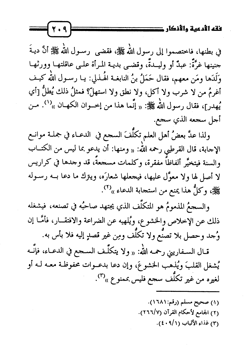 قال السفاريني رحمه الله: " ولا يتكلَّف السجع في الدعاء، فإنَّه يُشغل القلبَ ويُذهب الخشوعَ، وإن دعا بدعوات محفوظة معه له أو لغيره من غير تكلُّف سجع فليس بممنوع "3.