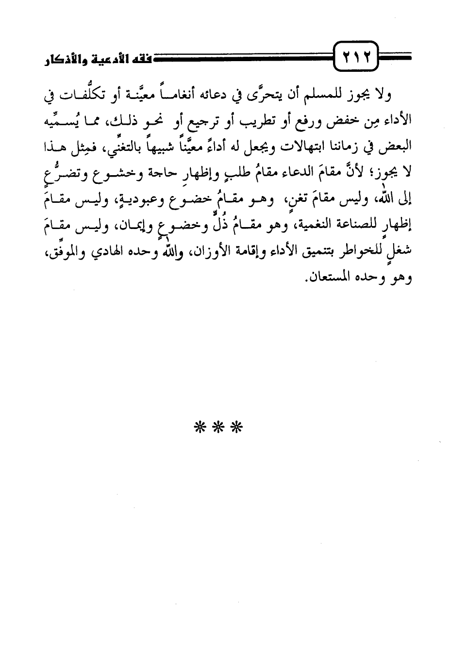 ولا يجوز للمسلم أن يتحرَّى في دعائه أنغاماً معيَّنة أو تكلُّفات في الأداء مِن خفض ورفع أو تطريب أو ترجيع أو نحو ذلك، مما يُسمِّيه البعض في زماننا ابتهالات ويجعل له أداءً معيَّناً شبيهاً بالتغنِّي، فمِثل هذا لا يجوز؛ لأنَّ مقامَ الدعاء مقامُ طلبٍ وإظهارِ حاجة وخشوع وتضرُّعٍ إلى الله، وليس مقامَ تغنٍ، وهو مقامُ خضوع وعبوديةٍ، وليس مقامَ إظهارٍ للصناعة النغمية، وهو مقامُ ذُلٍّ وخضوعٍ وإيمان، وليس مقامَ شغلٍ للخواطر بتنميق الأداء وإقامة الأوزان، والله وحده الهادي والموفِّق، وهو وحده المستعان.