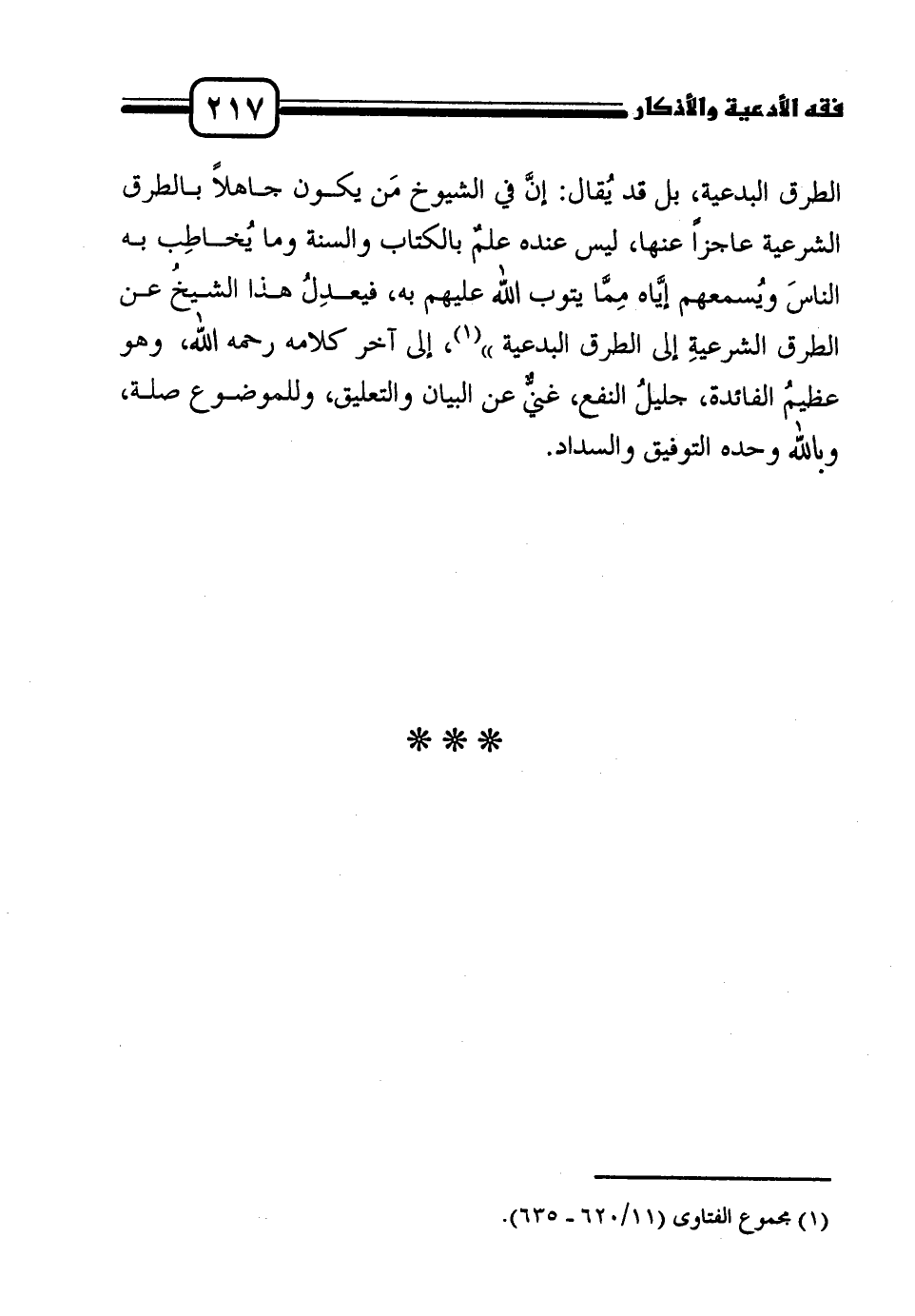 الطرق البدعية، بل قد يُقال: إنَّ في الشيوخ مَن يكون جاهلاً بالطرق الشرعية عاجزاً عنها، ليس عنده علمٌ بالكتاب والسنة وما يُخاطِب به الناسَ ويُسمعهم إيَّاه مِمَّا يتوب الله عليهم به، فيعدِلُ هذا الشيخُ عن الطرق الشرعيةِ إلى الطرق البدعية "1، إلى آخر كلامه رحمه الله، وهو عظيمُ الفائدة، جليلُ النفع، غنيٌّ عن البيان والتعليق، وللموضوع صلة، وبالله وحده التوفيق والسداد.