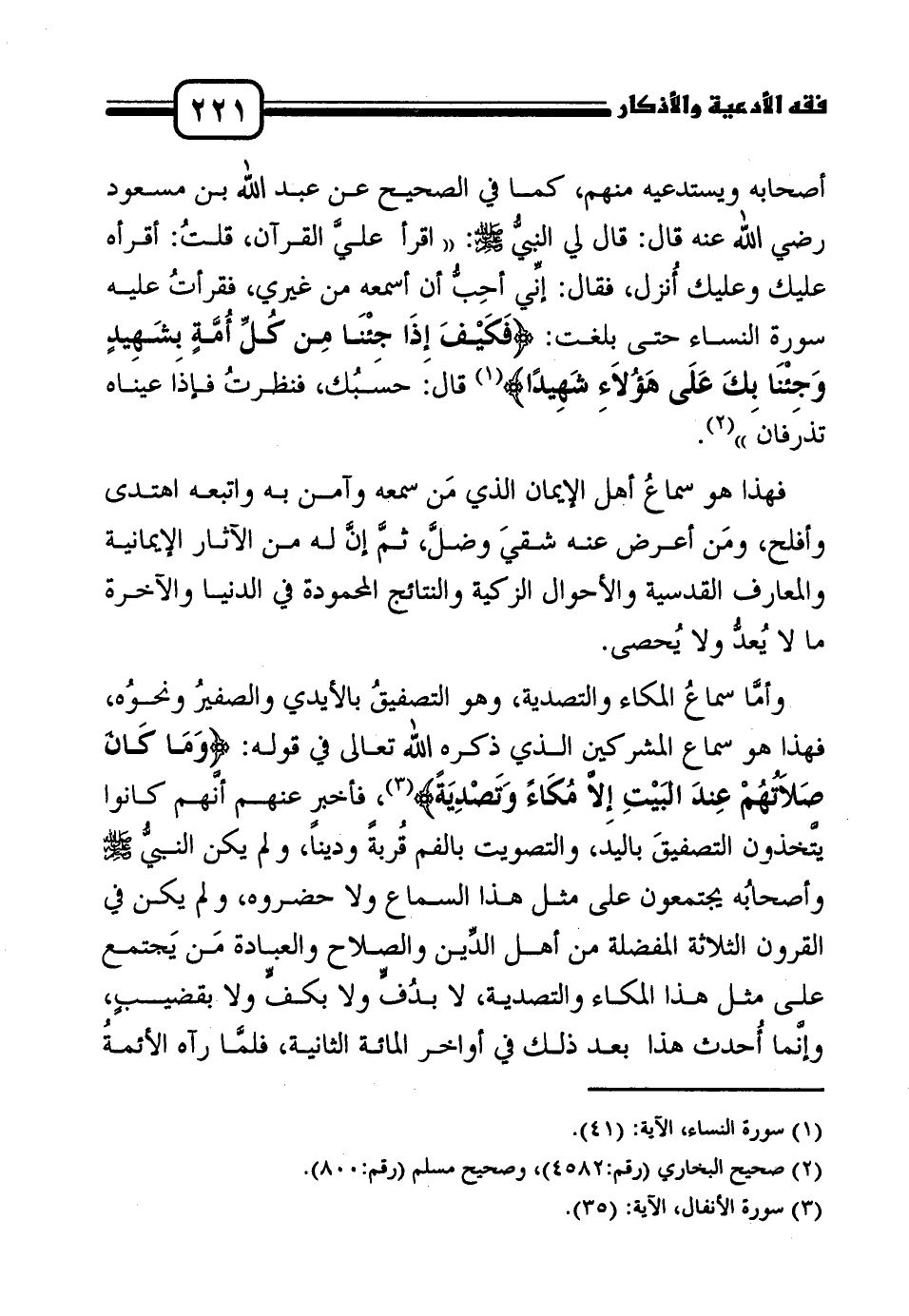 وأمَّا سماعُ المكاء والتصدية، وهو التصفيقُ بالأيدي والصفيرُ ونحوُه، فهذا هو سماع المشركين الذي ذكره الله تعالى في قوله: {وَمَا كَانَ صَلاَتُهُمْ عِندَ البَيْتِ إِلاَّ مُكَاءً وَتَصْدِيَةً} 3، فأخبر عنهم أنَّهم كانوا يتَّخذون التصفيقَ باليد، والتصويت بالفم قُربةً وديناً، ولم يكن النبيُّ صلى الله عليه وسلم وأصحابُه يجتمعون على مثل هذا السماع ولا حضروه، ولم يكن في القرون الثلاثة المفضلة من أهل الدِّين والصلاح والعبادة مَن يَجتمع على مثل هذا المكاء والتصدية، لا بدُفٍّ ولا بكفٍّ ولا بقضيبٍ، وإنَّما أُحدث هذا بعد ذلك في أواخر المائة الثانية، فلمَّا رآه الأئمةُ