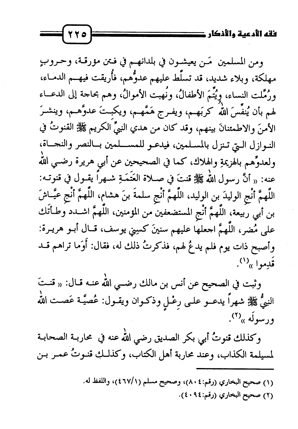 ومن المسلمين مَن يعيشون في بلدانهم في فتن مؤرقة، وحروبٍ مهلكة، وبلاء شديد، قد تسلَّط عليهم عدوُّهم، فأُريقت فيهم الدماء، ورُمِّلت النساء، ويُتِّمَ الأطفالُ، ونُهبت الأموالُ، وهم بحاجة إلى الدعاء لهم بأن يُنفِّسَ اللهُ كربَهم، ويفرج هَمَّهم، ويكبِتَ عدوَّهم، وينشرَ الأمنَ والاطمئنانَ بينهم، وقد كان من هدي النبيِّ الكريم صلى الله عليه وسلم القنوتُ في النوازل التي تنزل بالمسلمين، فيدعو للمسلمين بالنصر والنجاة، ولعدوِّهم بالهزيمةِ والهلاك، كما في الصحيحين عن أبي هريرة رضي الله عنه: " أنَّ رسول الله صلى الله عليه وسلم قنتَ في صلاة العَتَمَةِ شهراً يقول في قنوته: اللَّهمَّ أنْجِ الوليدَ بن الوليد، اللَّهمَّ أنْجِ سلمةَ بنَ هشام، اللَّهمَّ أنْجِ عيَّاشَ بن أبي ربيعة، اللَّهمَّ أنْجِ المستضعفين من المؤمنين، اللَّهمَّ اشدد وطأتَك على مُضر، اللَّهمَّ اجعلها عليهم سنينَ كسِني يوسف، قال أبو هريرة: وأصبح ذات يوم فلم يدعُ لهم، فذكرتُ ذلك له، فقال: أَوَما تراهم قد قَدِموا "1.